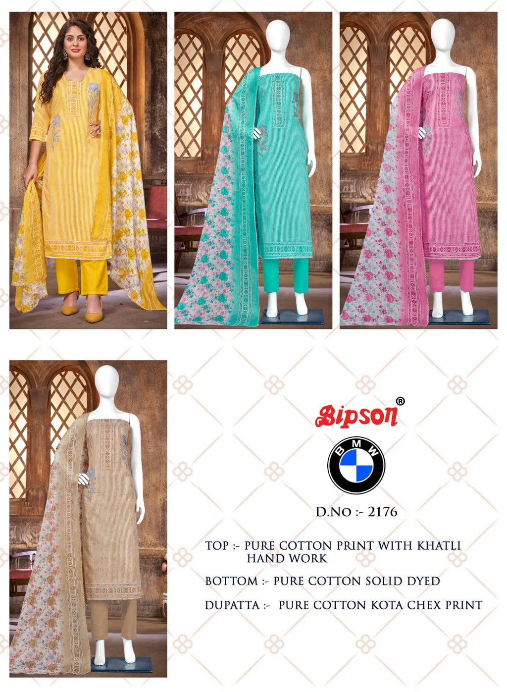 TOP :- _ Pure Cotton Print With Khatli Hand Work . BOTTOM :- Pure Cotton Dyed . DUPATTA :- _ Pure Cotton KOTA CHEX Print . |