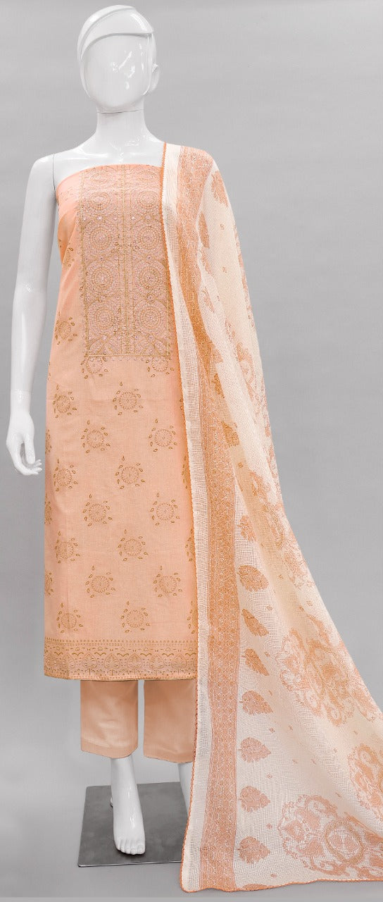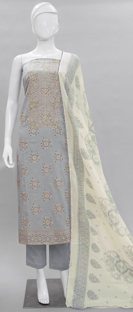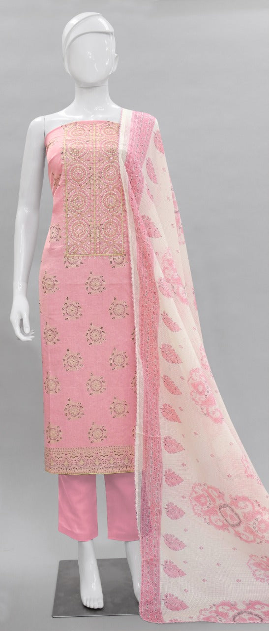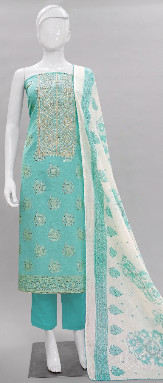 Fabric Details: Top :- _ Pure Cambric Cotton Foil Print With Embroidery & Mirror Work 2.5 Mtr Bottom :- _Pure Cotton Solid Dyed 2.7 Mtr Dupatta :- _ Kota Checks Print 2.25 Mtr