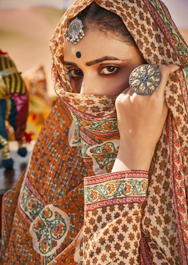 Fabric Details : Top: 100% Pure Premium Cotton Digital Print. (2.50 Mtrs) Dupatta: Exclusive Printed Pure Nazneen Chiffon. (2.30 Mtr) Bottom: Pure Cotton. (3 Mtrs) |