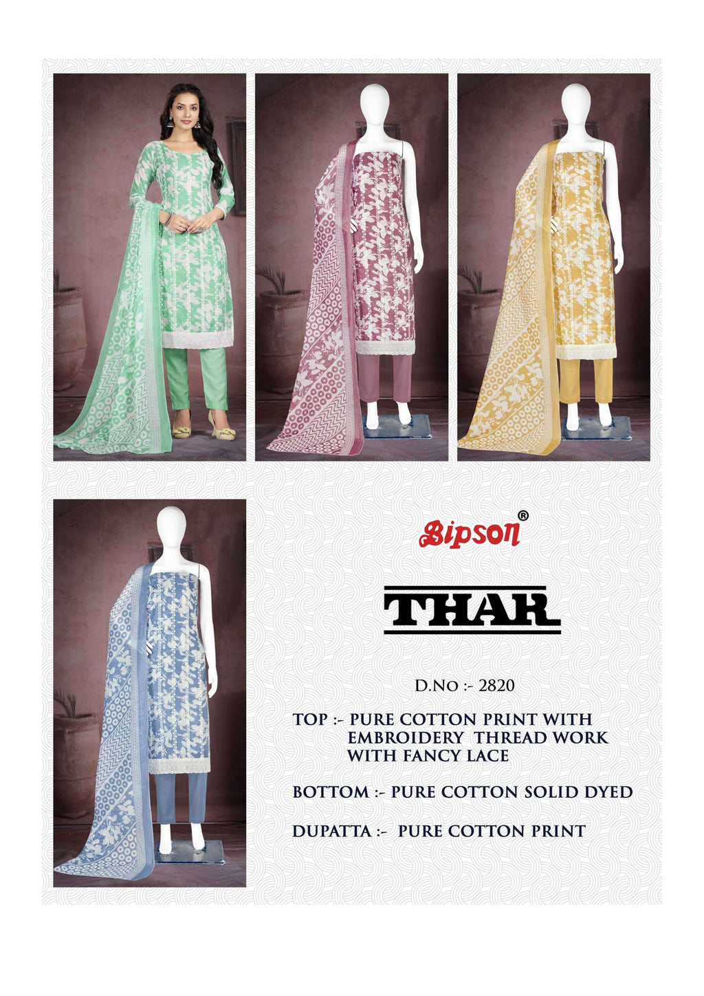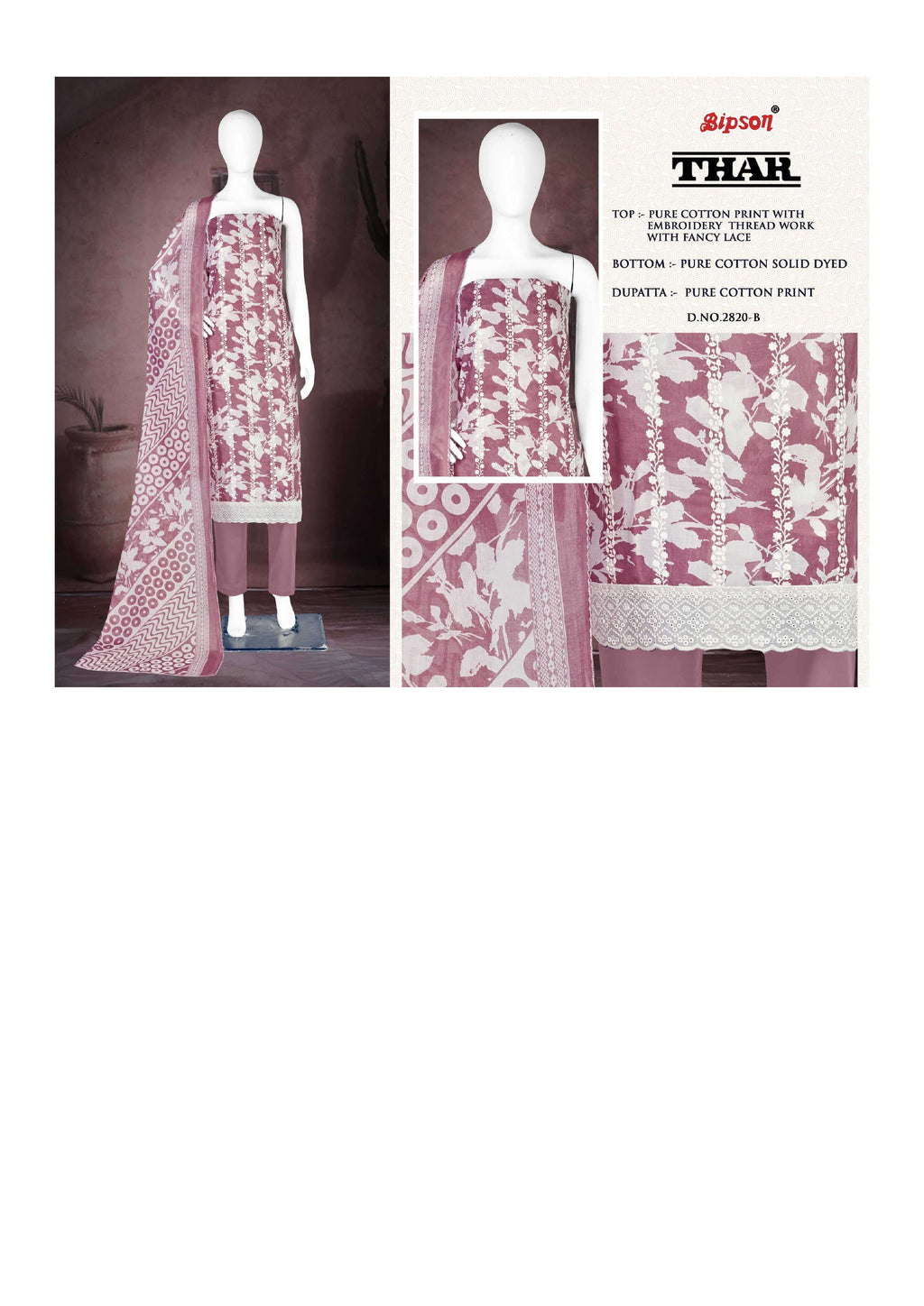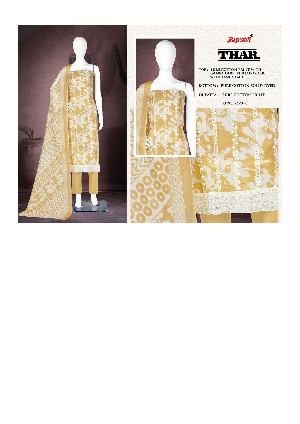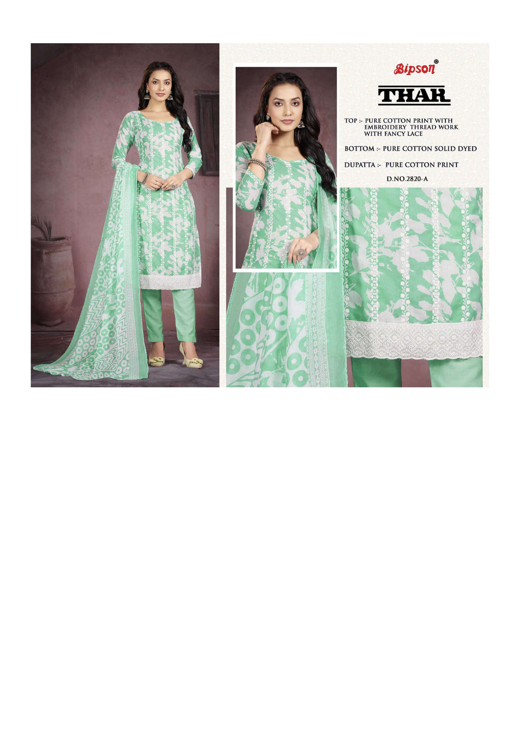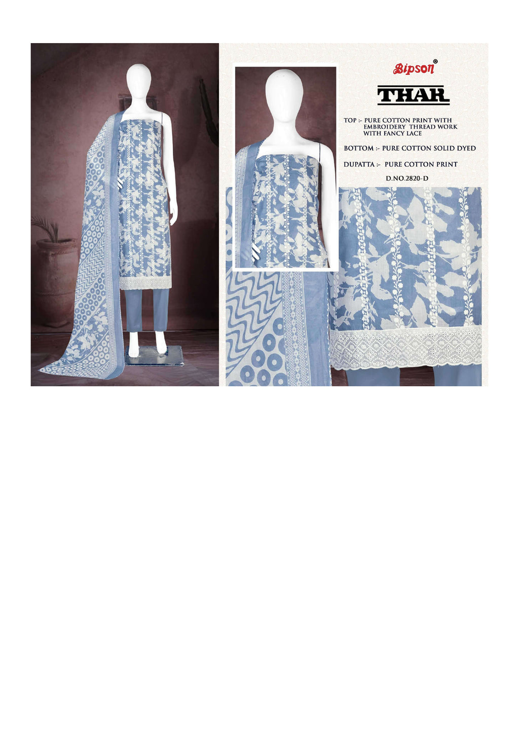 Top: pure cotton print with embroidery thread work with fancy lace Bottom: pure cotton solid dyed Dupatta: pure cotton print |
