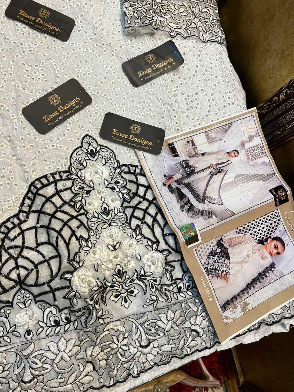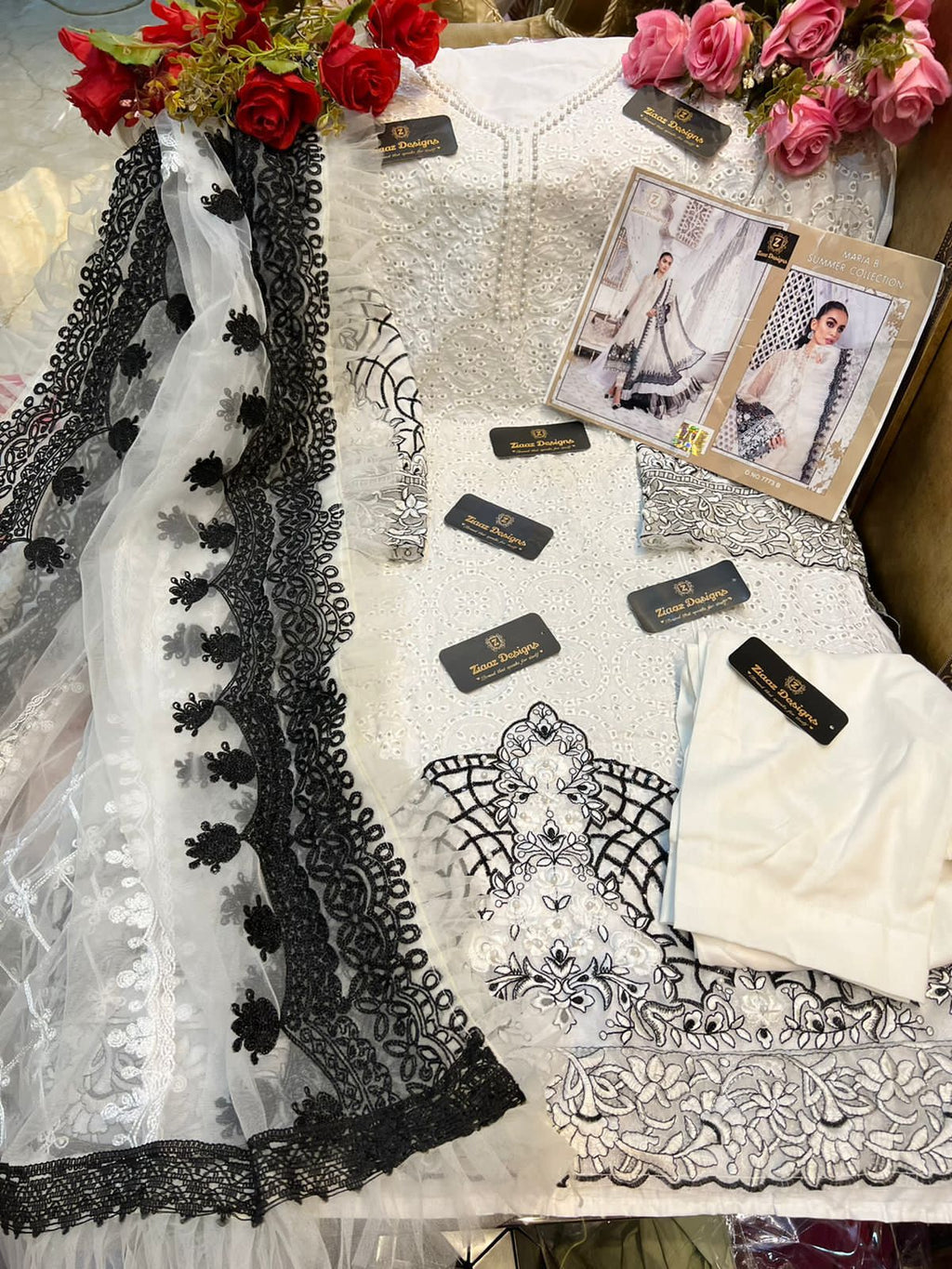 Mariab Summer collection Z series MB Black white💗 Cotton semi stitched embroidered kameez with pearls on neck and daaman😍 ✨unstitched rayon cotton bottoms 🌹Net Embroidered beautiful dupatta with frills❣️ Dispatch tom RATE:-1400/- |