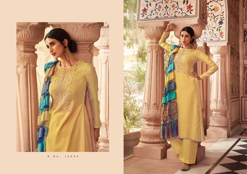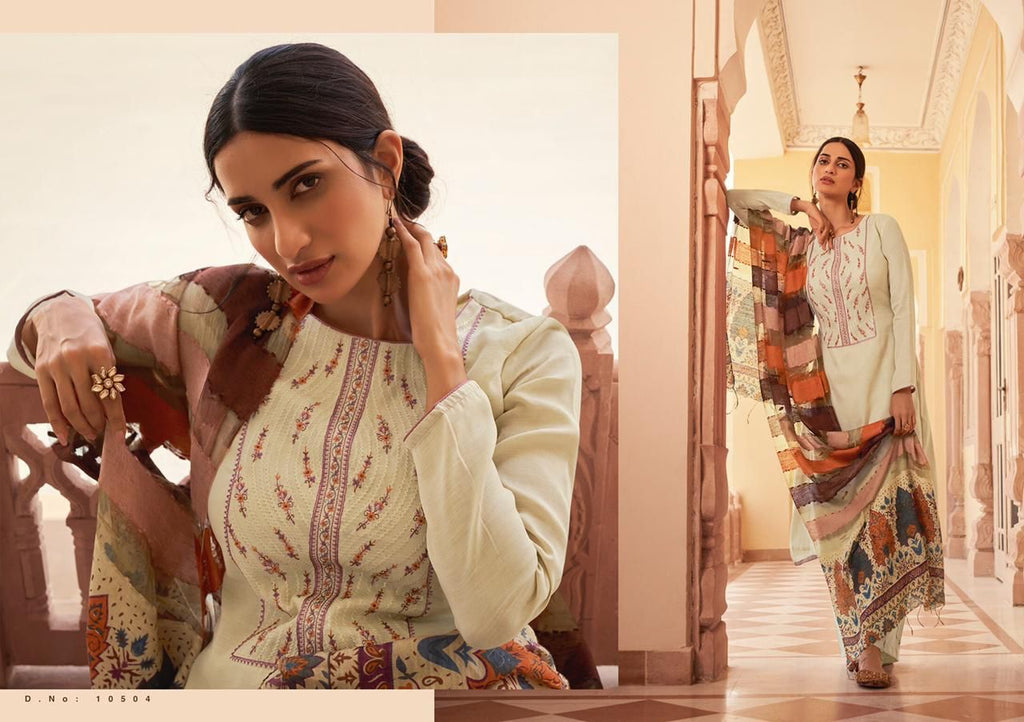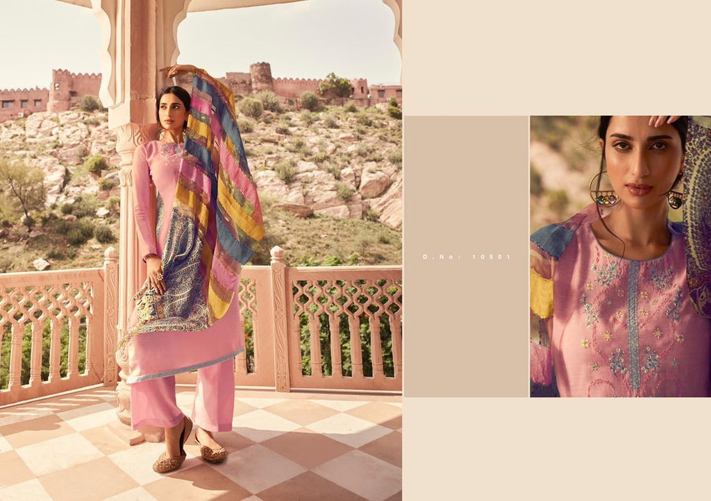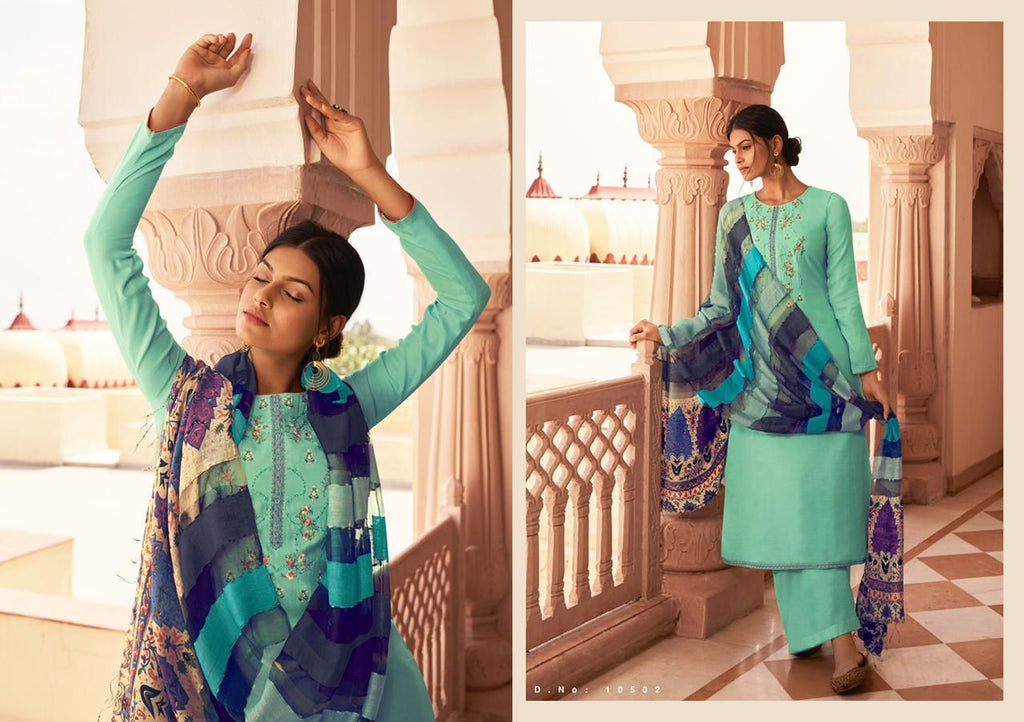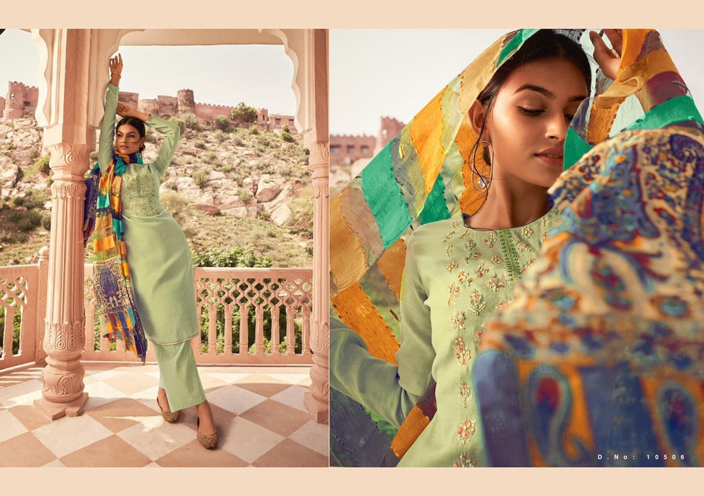 Fabric Details : Top – Linen Silk With Embroidery Bot – Dull Santoon Dup – Pure Silk Hand Weave With Digital Print |