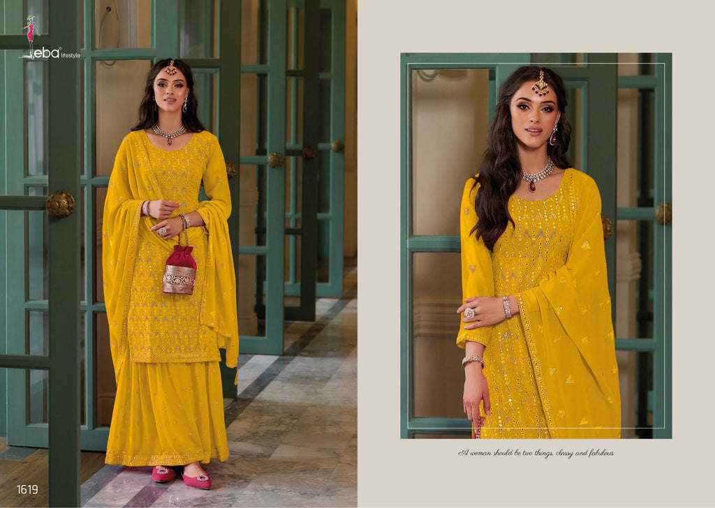 Top – baluming gourgette with hevey embroidery work Duppta- baluming gourgette with hevey embroidery work plazo- bluming gourgette with hevey embroidery (front &back) |