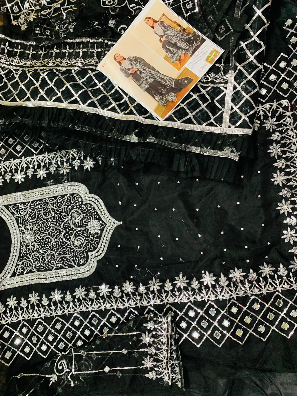 Fabric Details : Top : Organza With Heavy Handwork Embroidery Dupatta : Fancy Stitched Embroidered Dupatta With 4 Sides Frill Lace & Pearl Work Bottom : Santoon With Embroidered Patch Inner : Santoon |