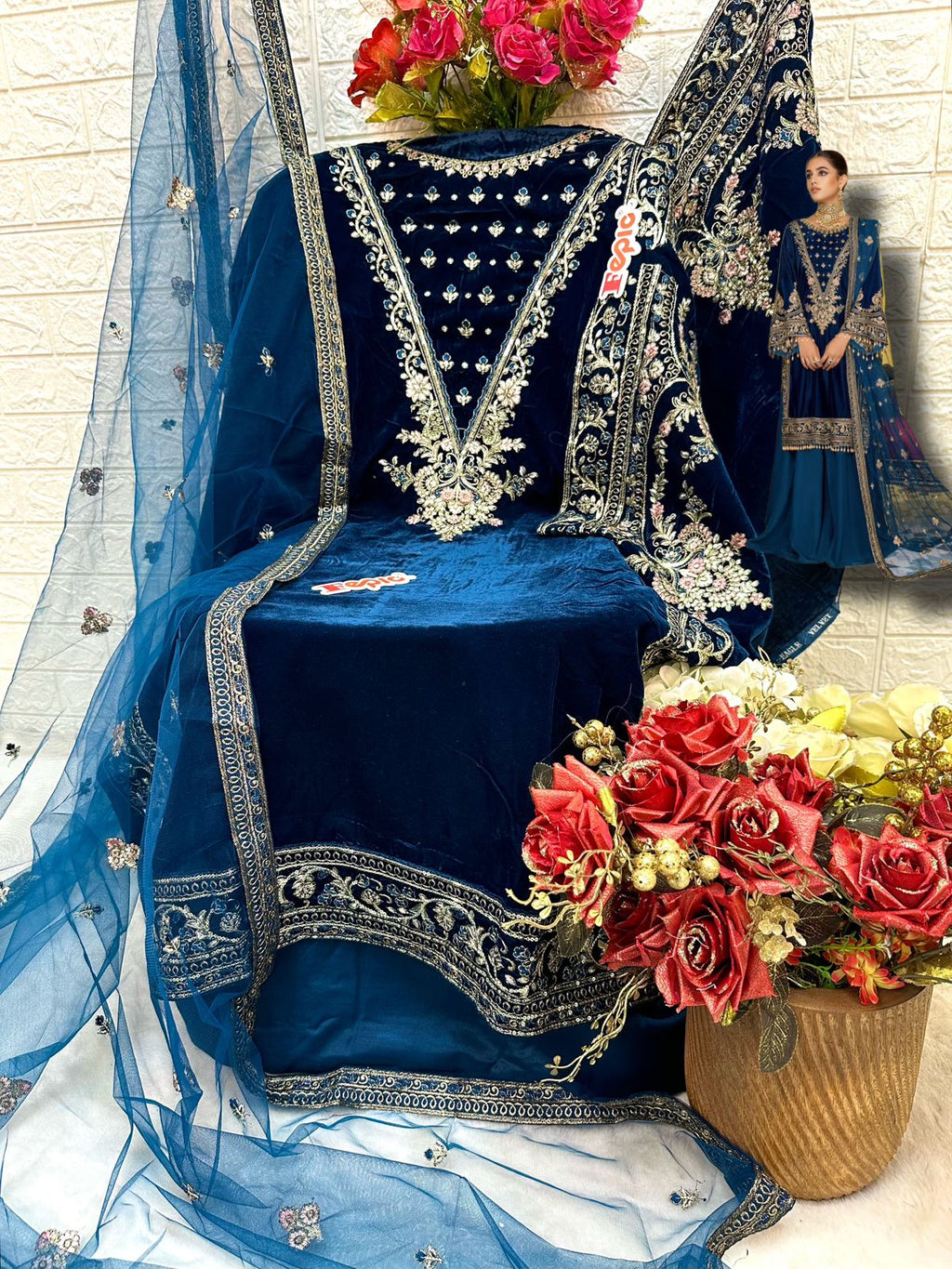 Top:- VELVET EMBROIDERED Dupatta:- HEAVY EMBROIDERED NET Bottom:- SANTOON |