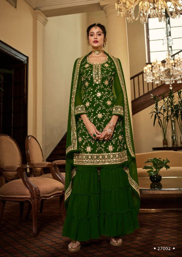 TOP – GORGETTE WITH HEAVY EMBROIDERY AND SEQUENCE WORK BOTTOM – STICHED PLAZZO AND SHARARA WITH INNER DUPPATA – GORGETTE HEAVY EMBROIDERY DUPPATA |