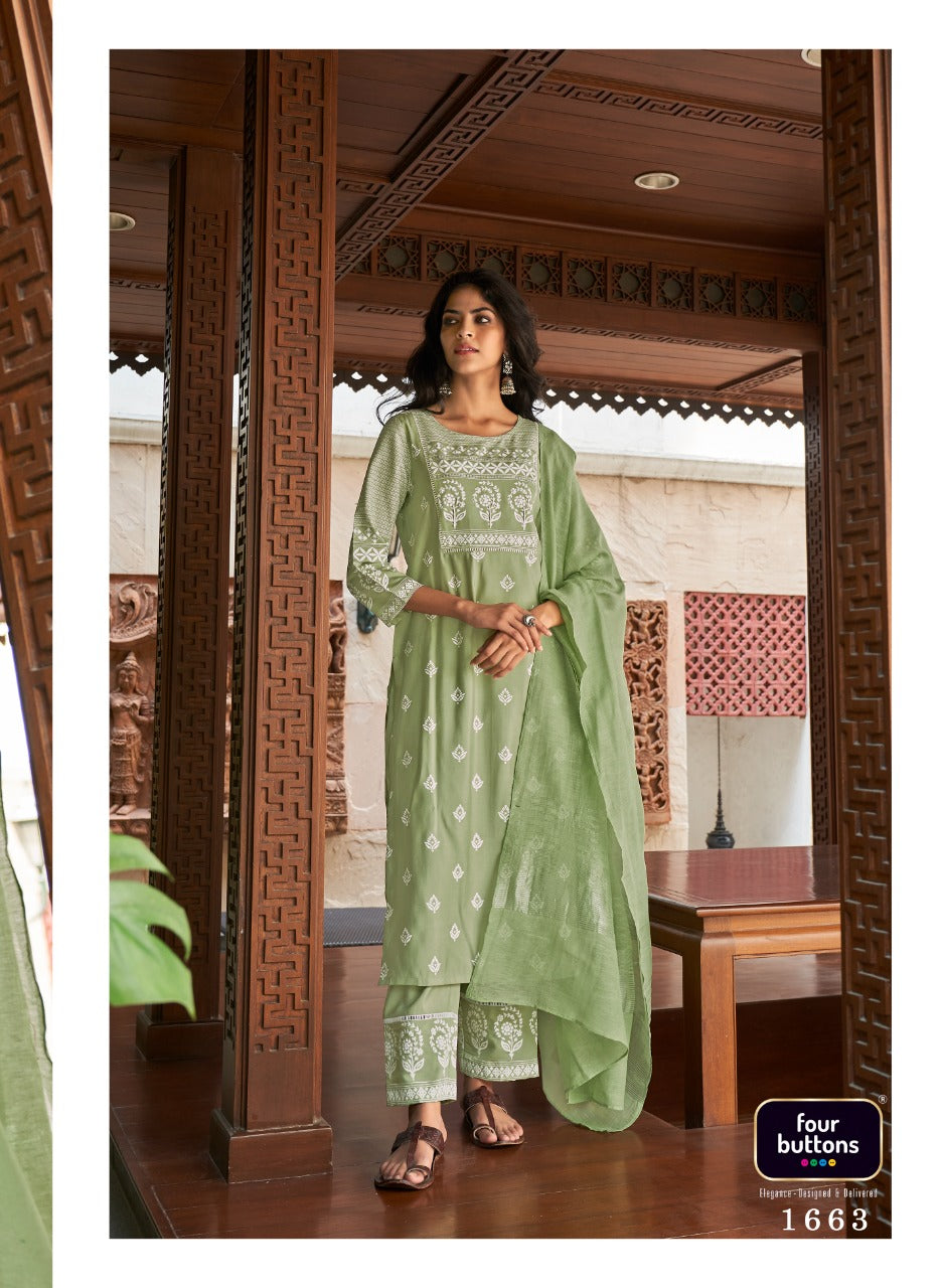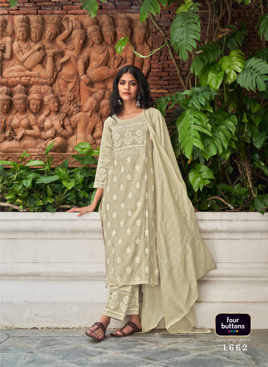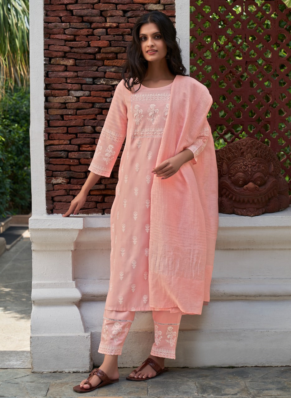 KURTI – PLACEMENT PRINTS WITH HANDWORK ON VISCOSE BY MODAL CHANDERI SILK BOTTOM – PLACEMENT PRINT ON VISCOSE BY MODAL CHANDERI SILK DUPATTA- PURE LINEN WEAVING ZARI |
