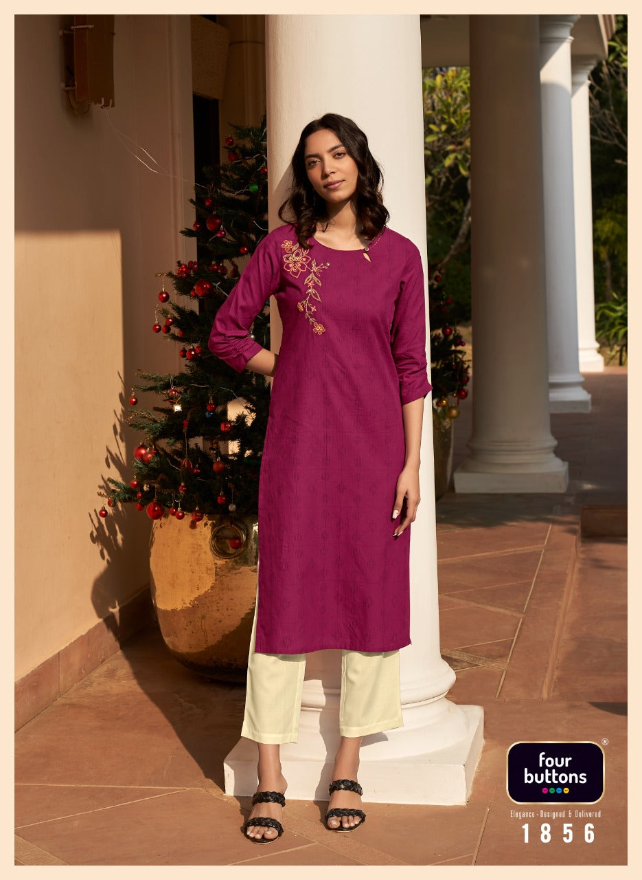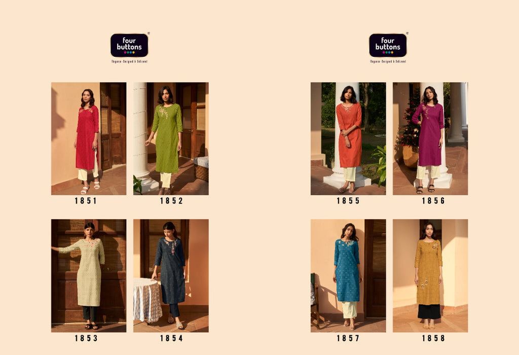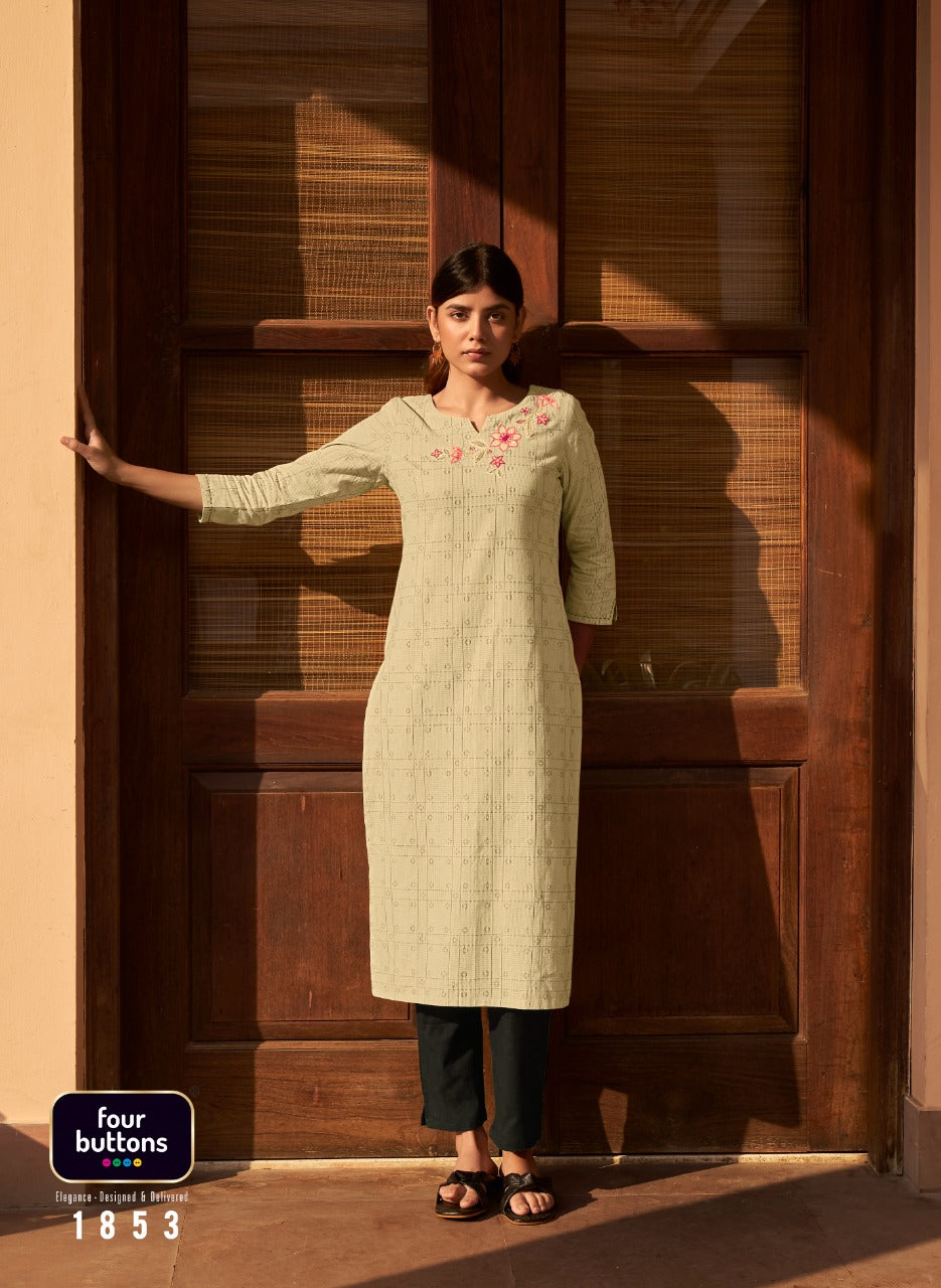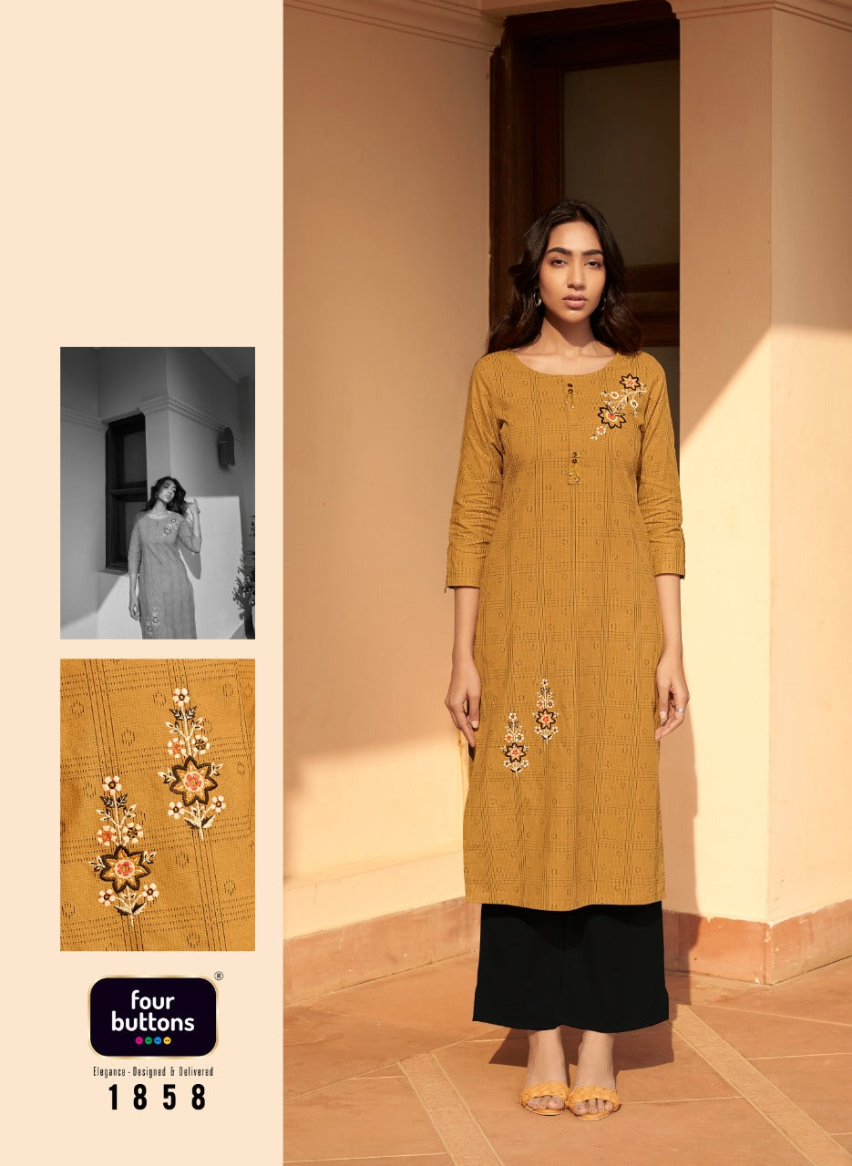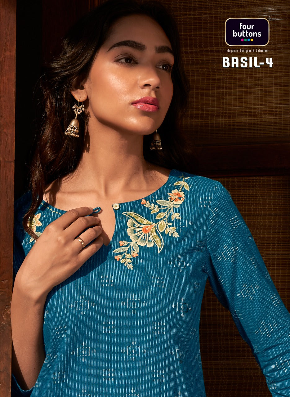 Four Buttons Basil Vol 4 Pure Cotton With Heavy Embroidery work Stylish Designer Casual Wear Kurti