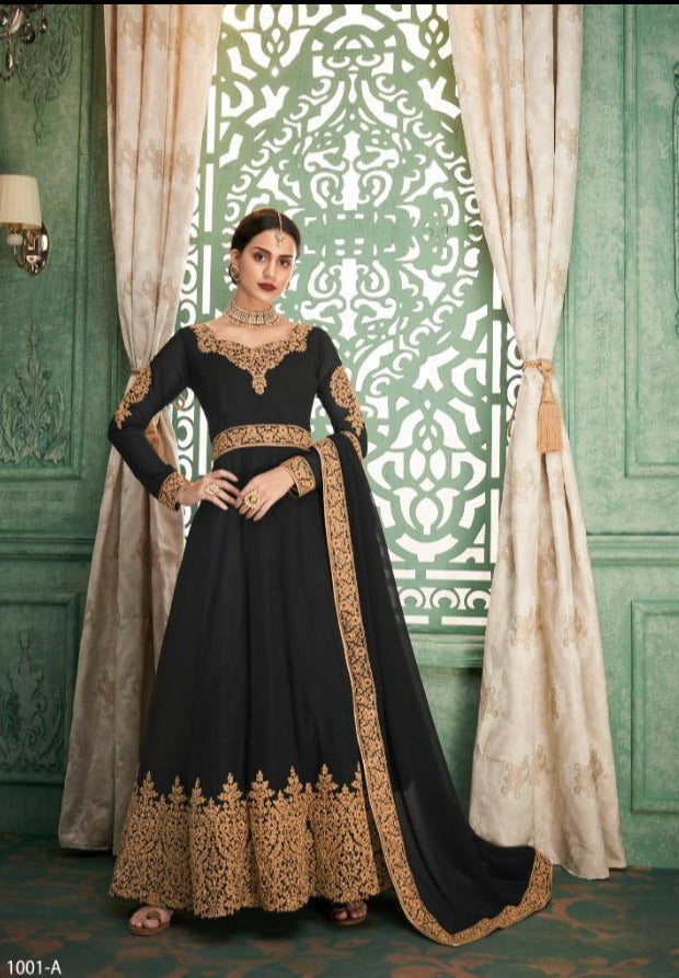 Description Top: * *Heavy Fox Georgette * With Heavy Embroidery Additional Touch * Size —- L – XL – XXL —XXXL Bottom -Heavy Dull Santoon Semi Stich (3Mtr) Dupatta -Heavy Fox Georgette With Four Side Work |