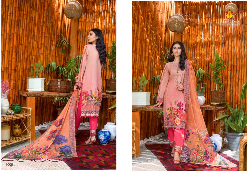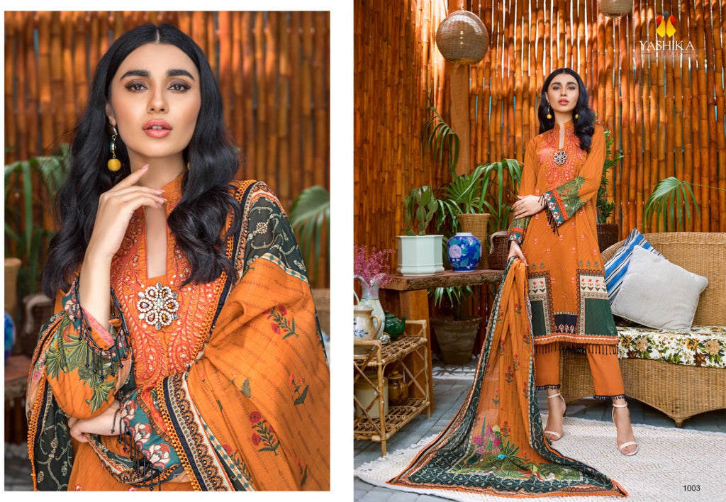 YASHIKA TRENDS MAKE IN INDIA LAUNCHES ITS NEW DESIGNER KARACHI SUITS CATLOG AMIRA .B VOL -1 Fabric Details Top: HEAVY CAMBRIC (Cut- 2.5 mtr approx) Bottom: HEAVY CAMBRIC (2mtr approx) Dupatta: Pure Mal mal (Cut :- 2.25 approx)RATE:- 350 |