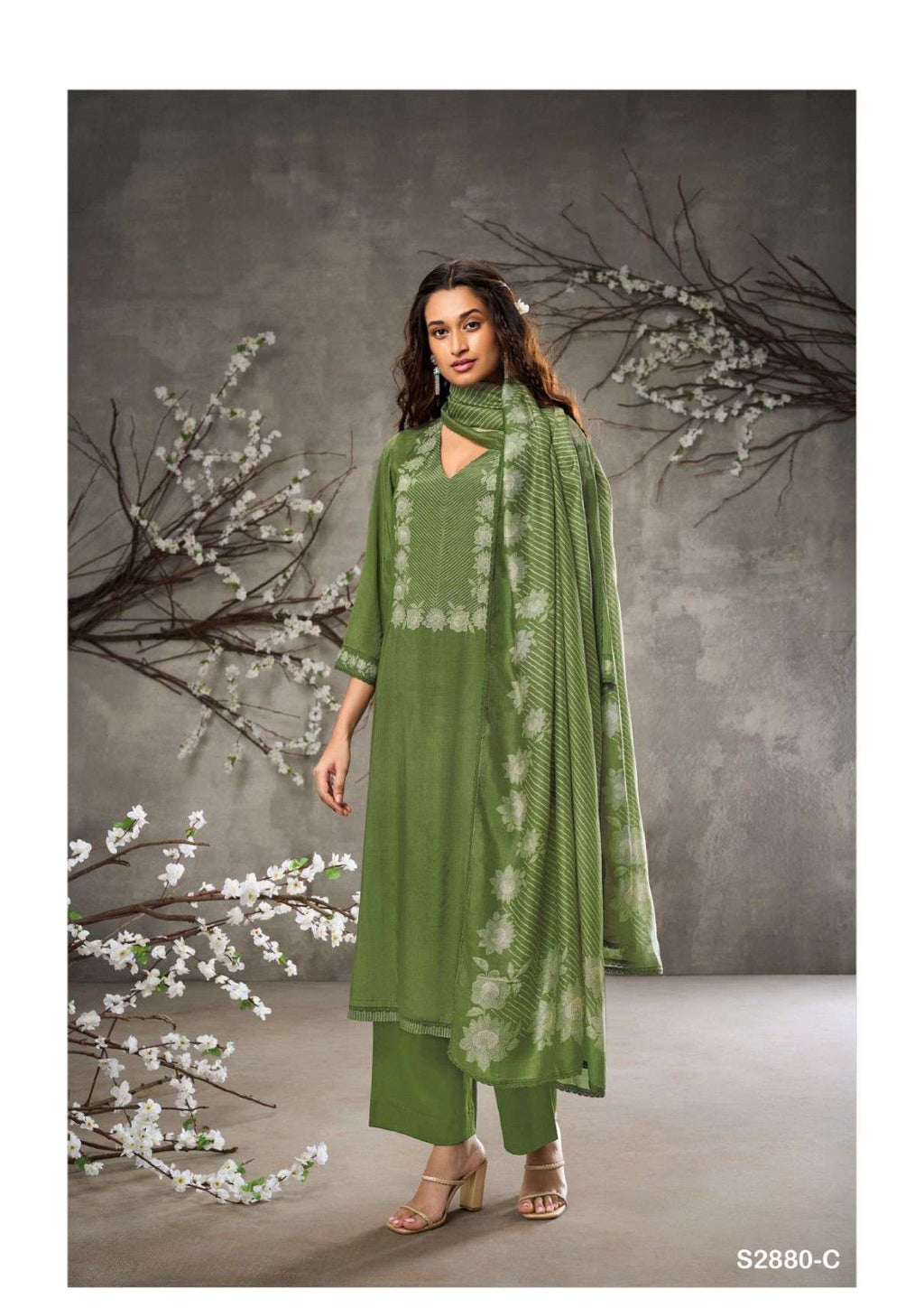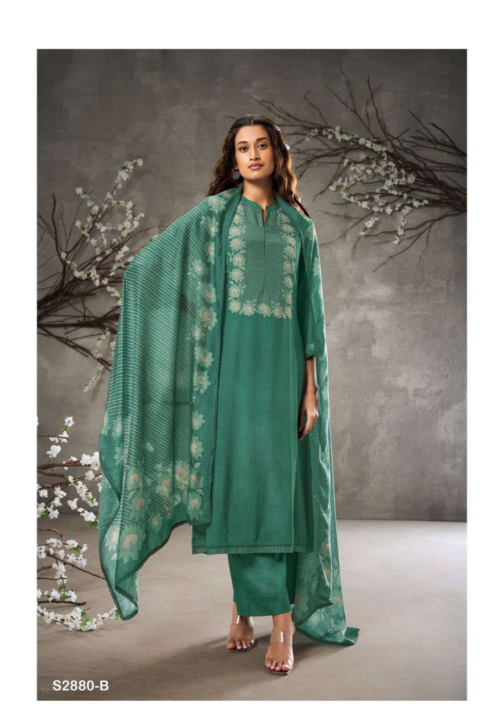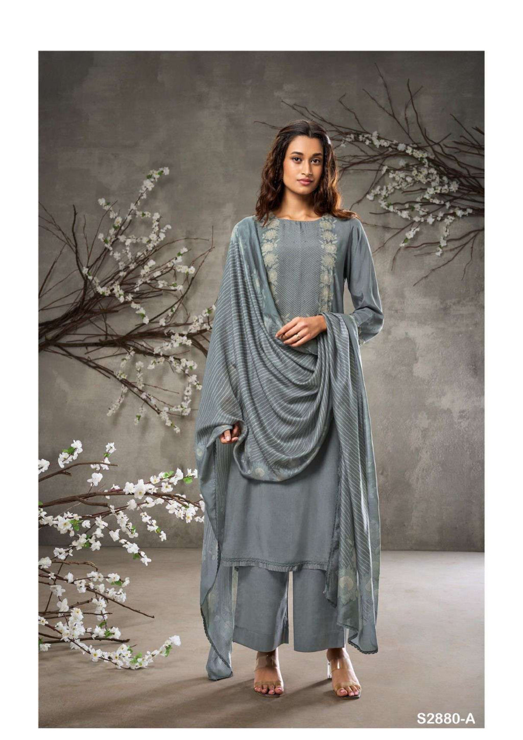 Top: premium viscose muslin printed with hand embroidery and handwork printed silk with lace for daman Bottom: premium silk satin solid colour Dupatta: premium bemberg silk printed with four side cotton lace |