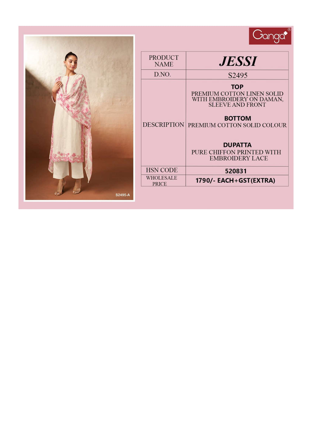 Top: premium cotton linen solid with embroidery on daman sleeves and front Bottom: premium cotton solid colour Dupatta: pure chiffon printed with embroidery lace |