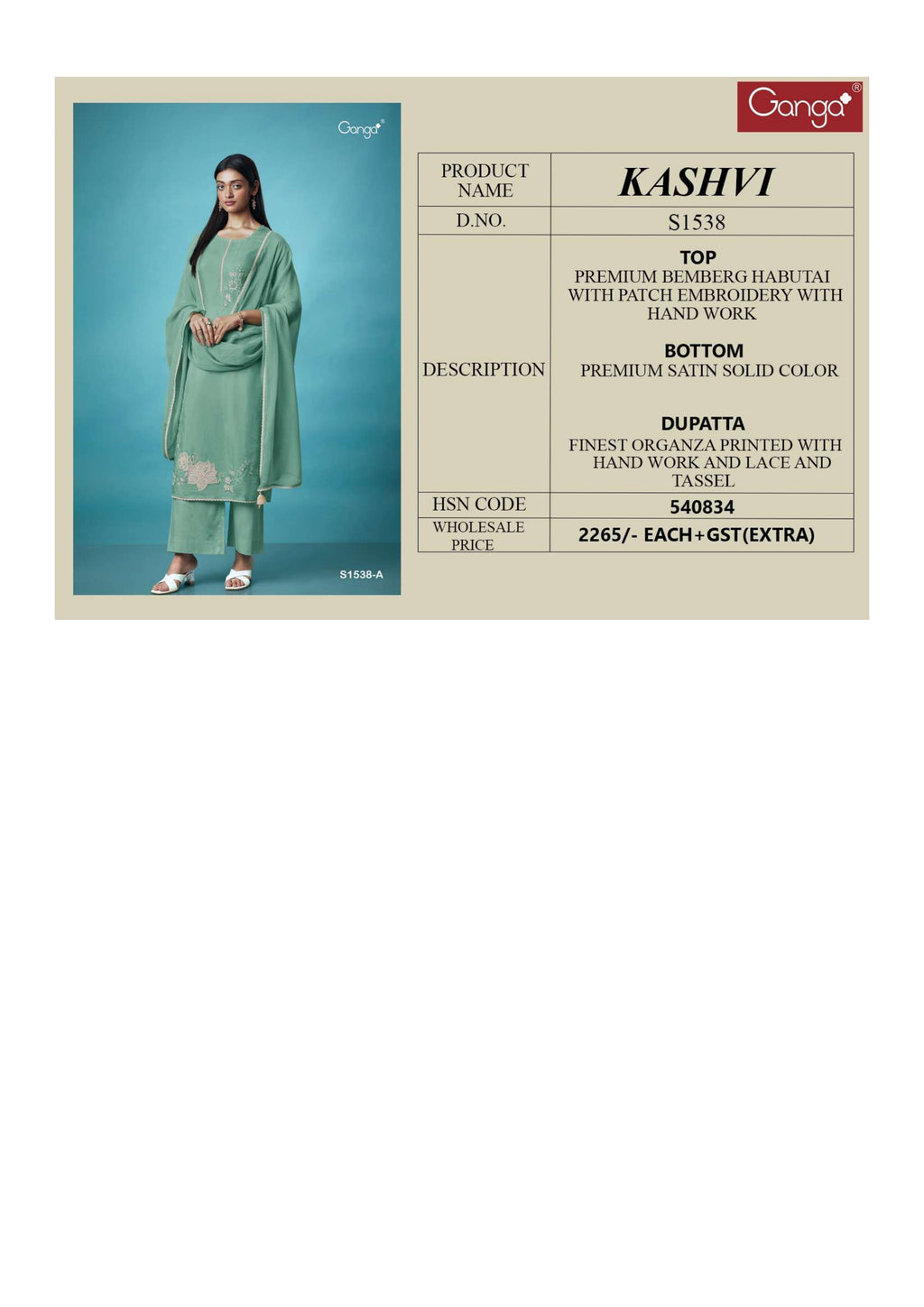 Ganga Fashion Kashvi 1538 Bemberg Habotai Patch Embroidery Work Fancy Salwar Suit