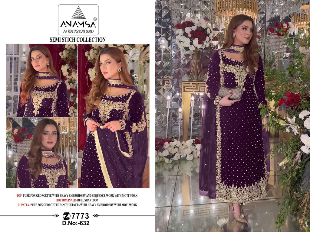 heavy pure fox georgette with heavy embroidered with sequence work and moti work very beautiful semi stitched outfit unstitched heavy dull shantoon bottom very beautiful pure georgette heavy fancy dupatta with heavy embroidery and moti work inner- dull shantoon |