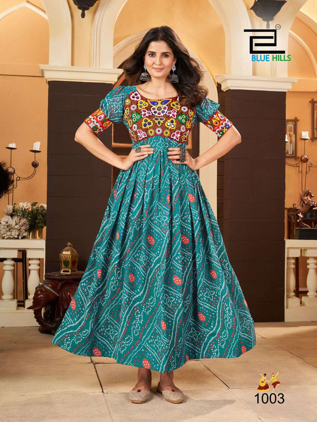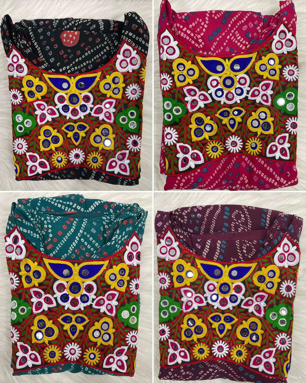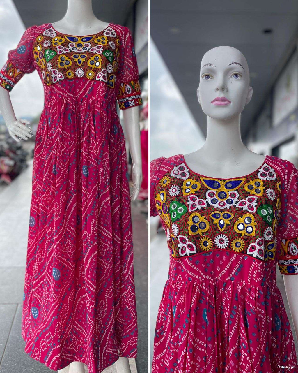 long frill gown with heavy gamthi work and real mirror and designer back pattern fabric: heavy georgette print with gamthi work canvas at bottom size: length:52” rate: 950/+gst |