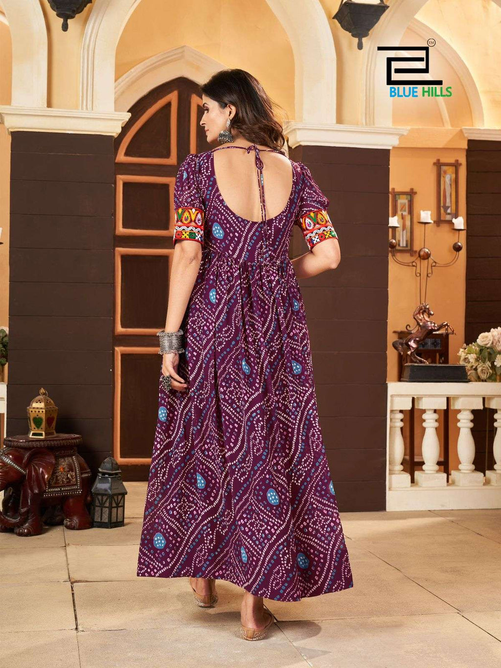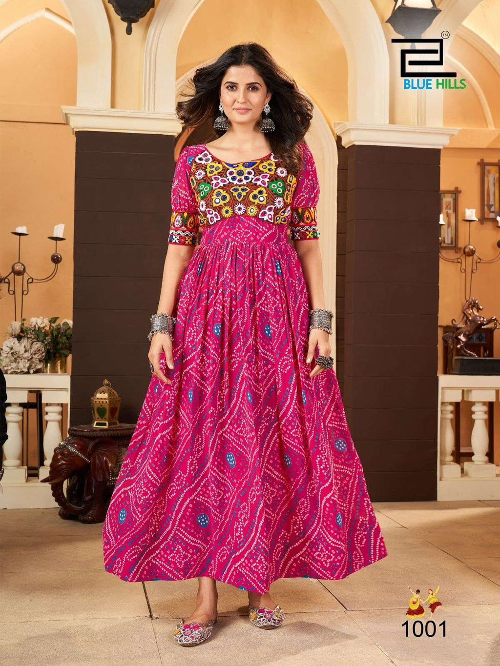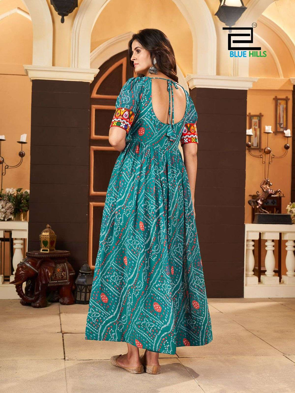 long frill gown with heavy gamthi work and real mirror and designer back pattern fabric: heavy georgette print with gamthi work canvas at bottom size: length:52” rate: 950/+gst |