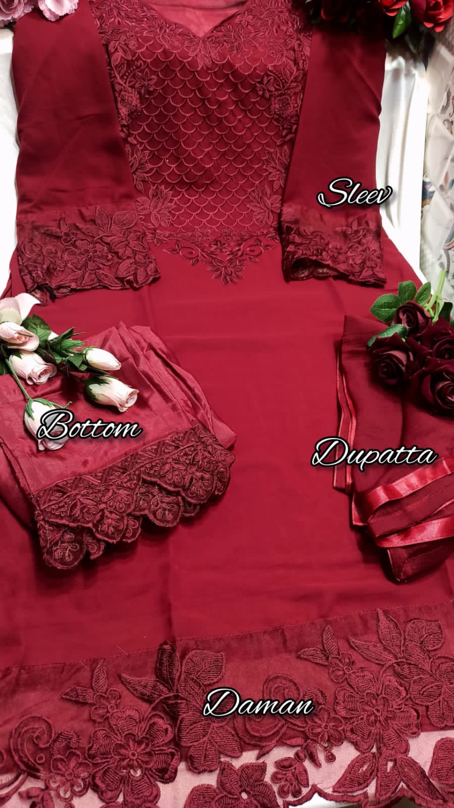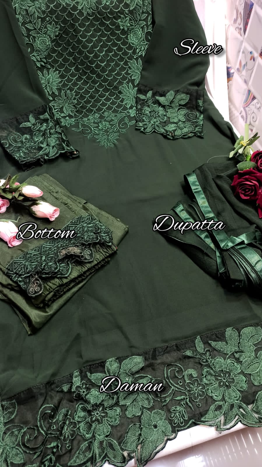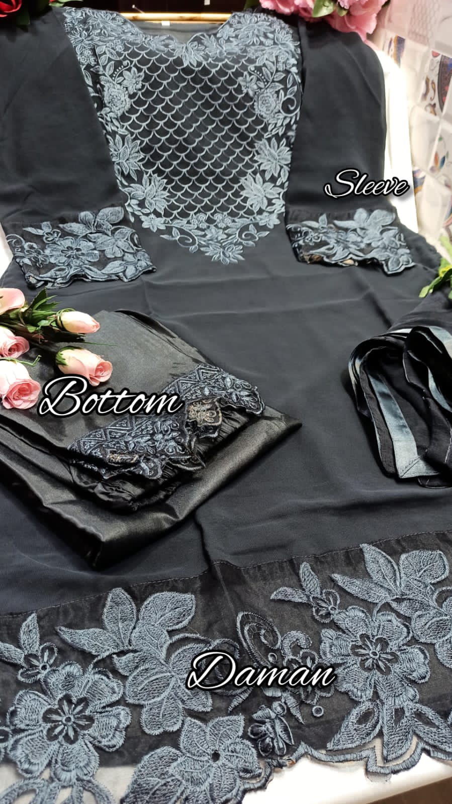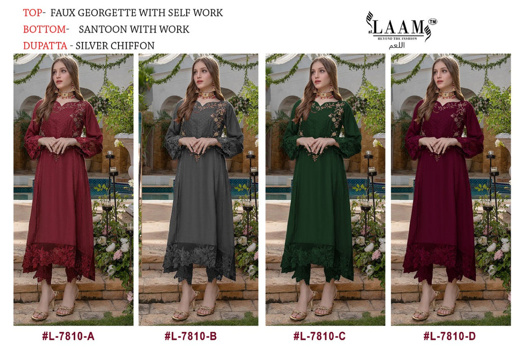Al Laam D No 7810 Fox Georgette Designer Pakistani Style Festive Wear Kurtis With Bottom & Dupatta