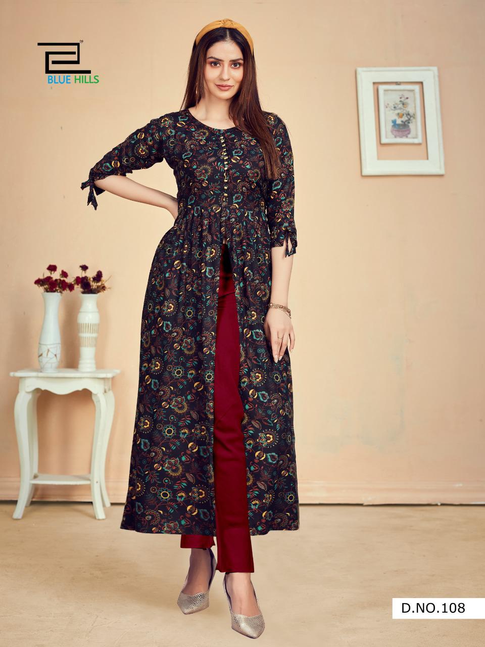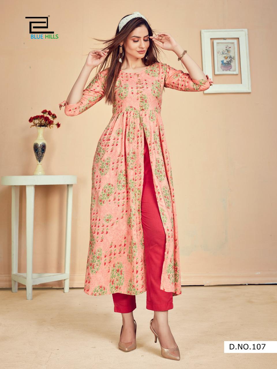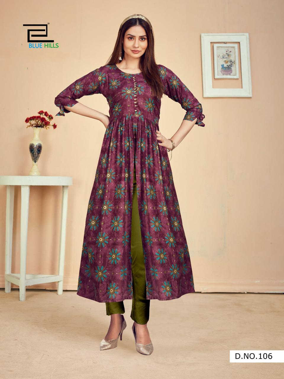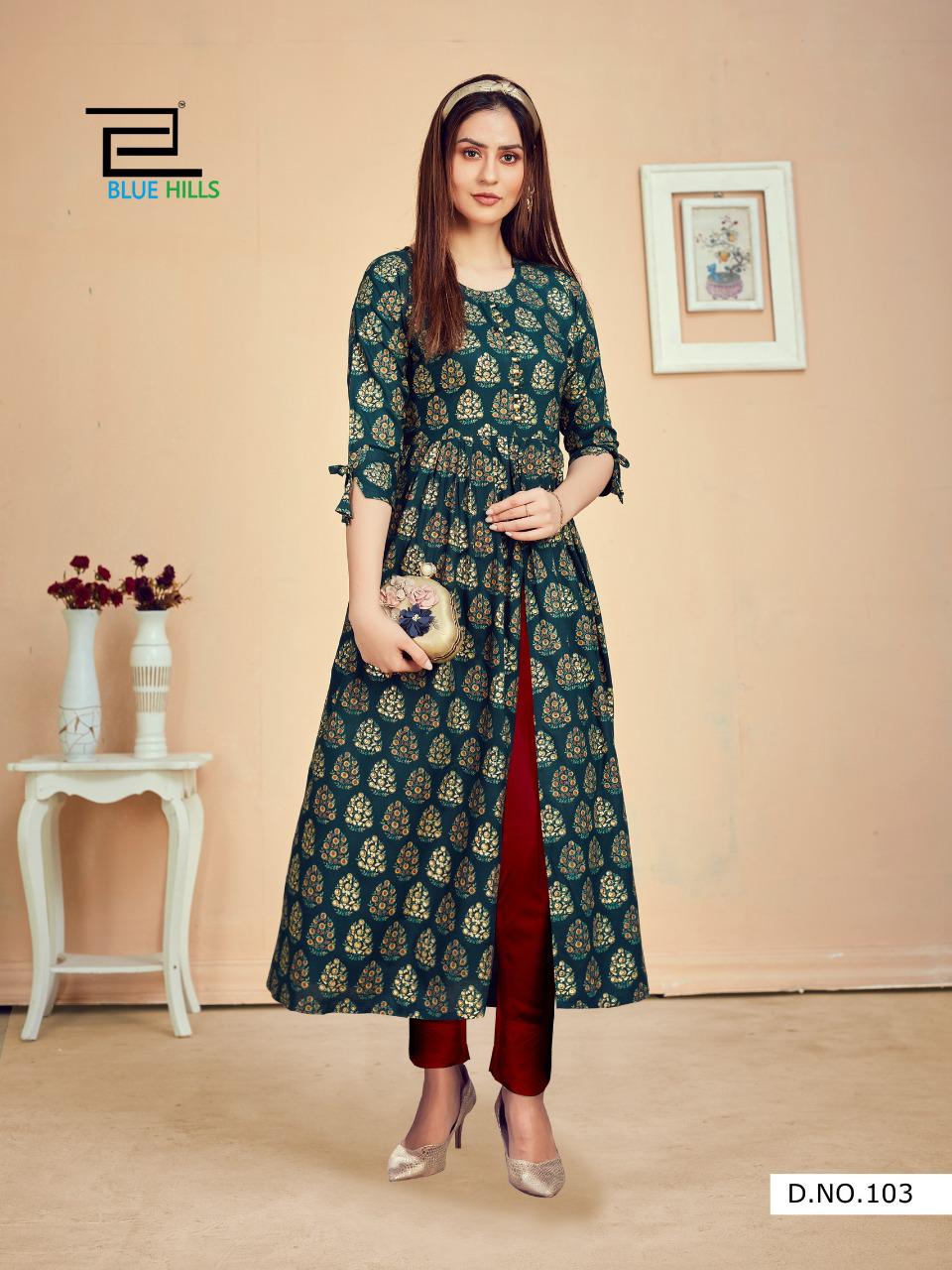 BLUE HILLS (KURTI) Presents CALENDER VOL -5 – RAYON 14 KG Foil print – centre Cut With Frill Size: M (38) L (40) XL (42) XXL (44) 3XL (46) 4XL (48) 5XL (50) Rate 499+GST 8 BEAUTIFUL DESIGNS |