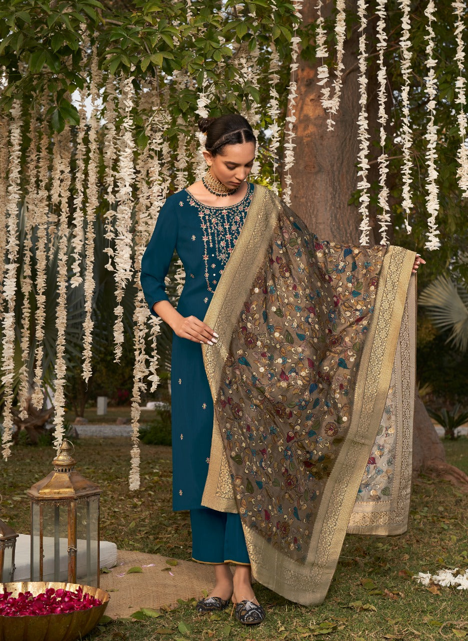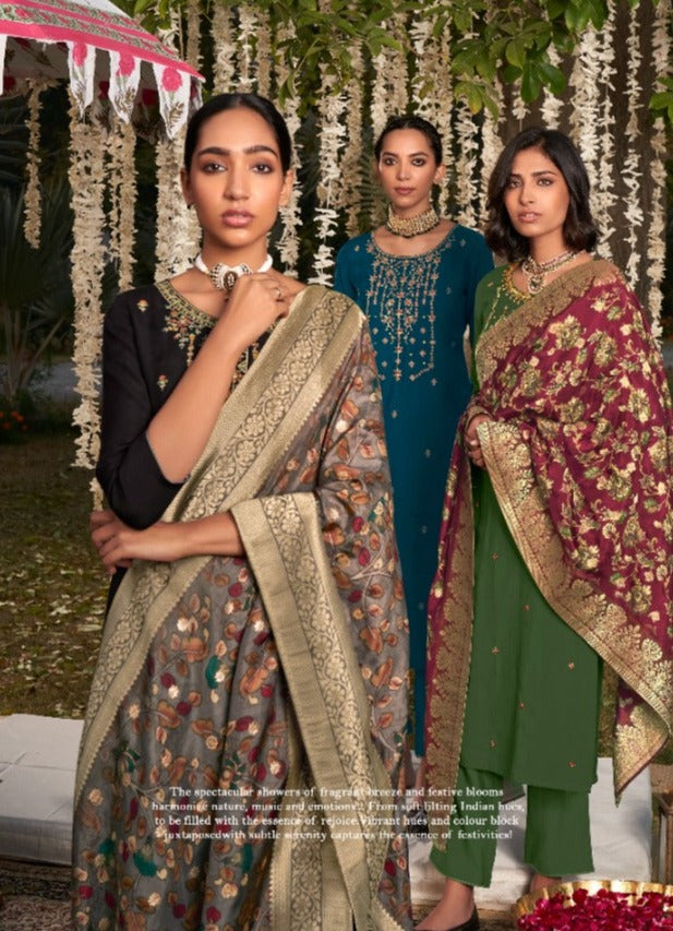 Kurti : Intricate Embroidery With Heavy Handwork On Pure Viscose Silk                                                                                 Bottom : Pure Viscose Silk                                                         Dupatta : Placement Digital Print On Pure Russian Jacquard