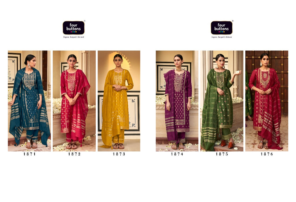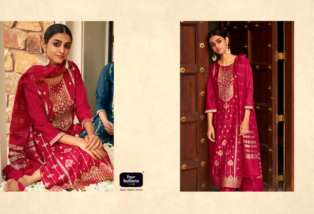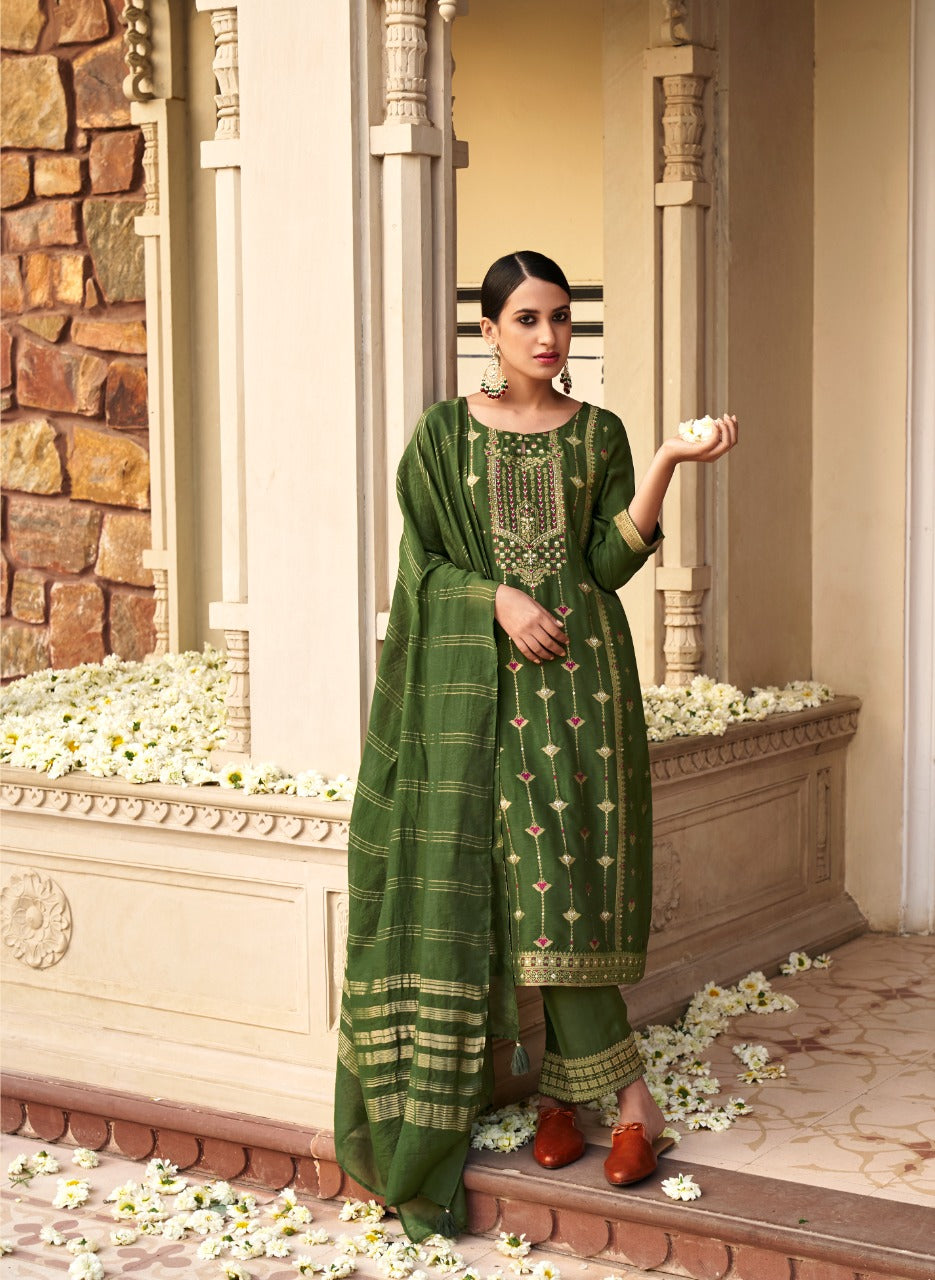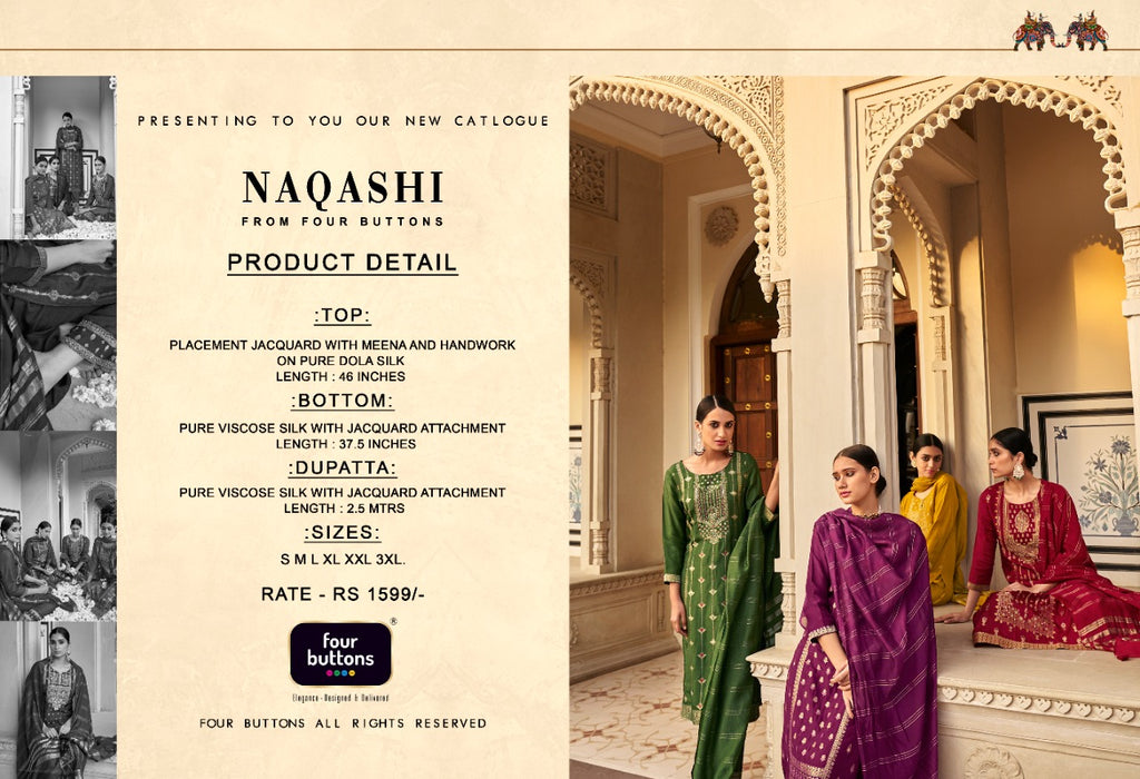 FABRIC KURTI – PLACEMENT JACQUARD WITH MEENA AND HANDWORK ON PURE DOLA SILK BOTTOM – PURE VISCOSE SILK WITH JACQUARD ATTACHMENT DUPATTA- PURE VISCOSE WEAVING ZARI RATE – Rs 1599/- SIZES – S, M, L, XL, XXL |