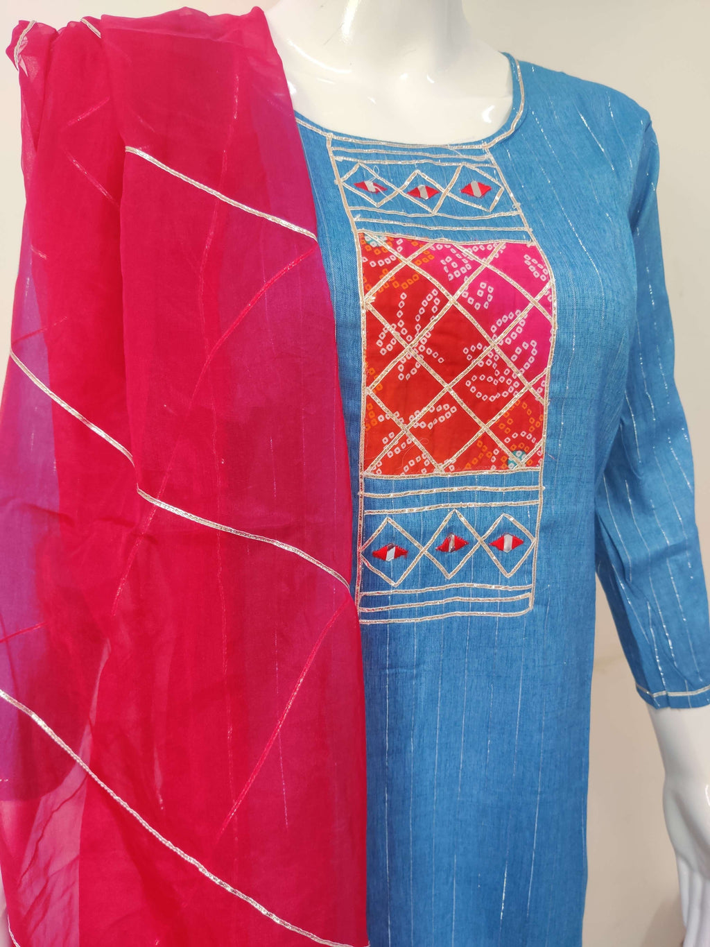 HEAVY RAYON LUREX TOP WITH HAND WORK,  ORGANZA DUPATTA  WITH LACE WORK AND COTTON BANDHANI SHARARA WITH LACEWORK TOO.