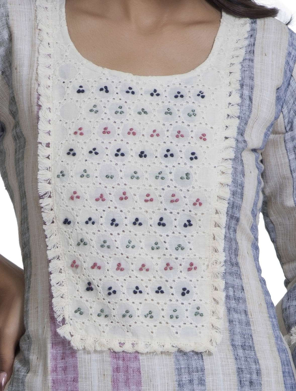 HEAVY COTTON STRIPES KURTI WITH HANDWORK AND LACEWORK. SETWISE - SIZES- L, XL, XXL RATE ; RS 440 + 5% GST |