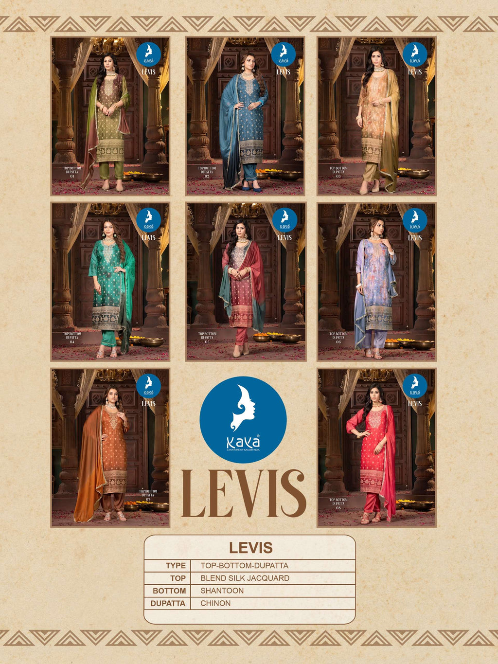 top:blend chanderi silk jacquard with astar bottom:heavy shantoon with one side pocket dupatta:chinon dyed with fancy less super quality fabrics |