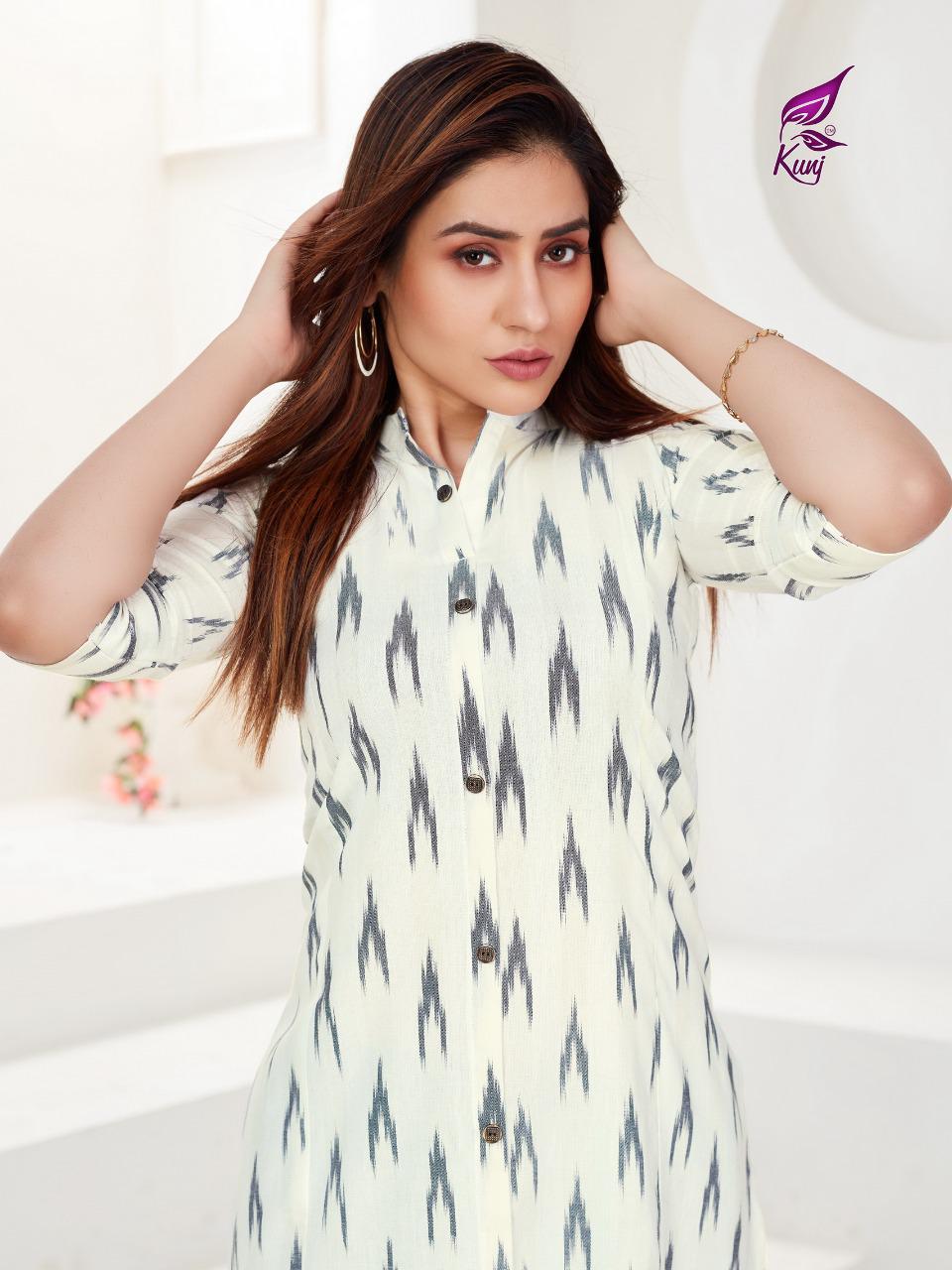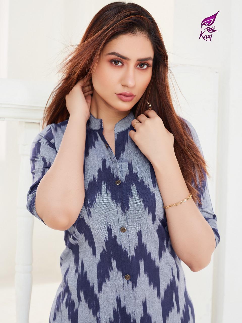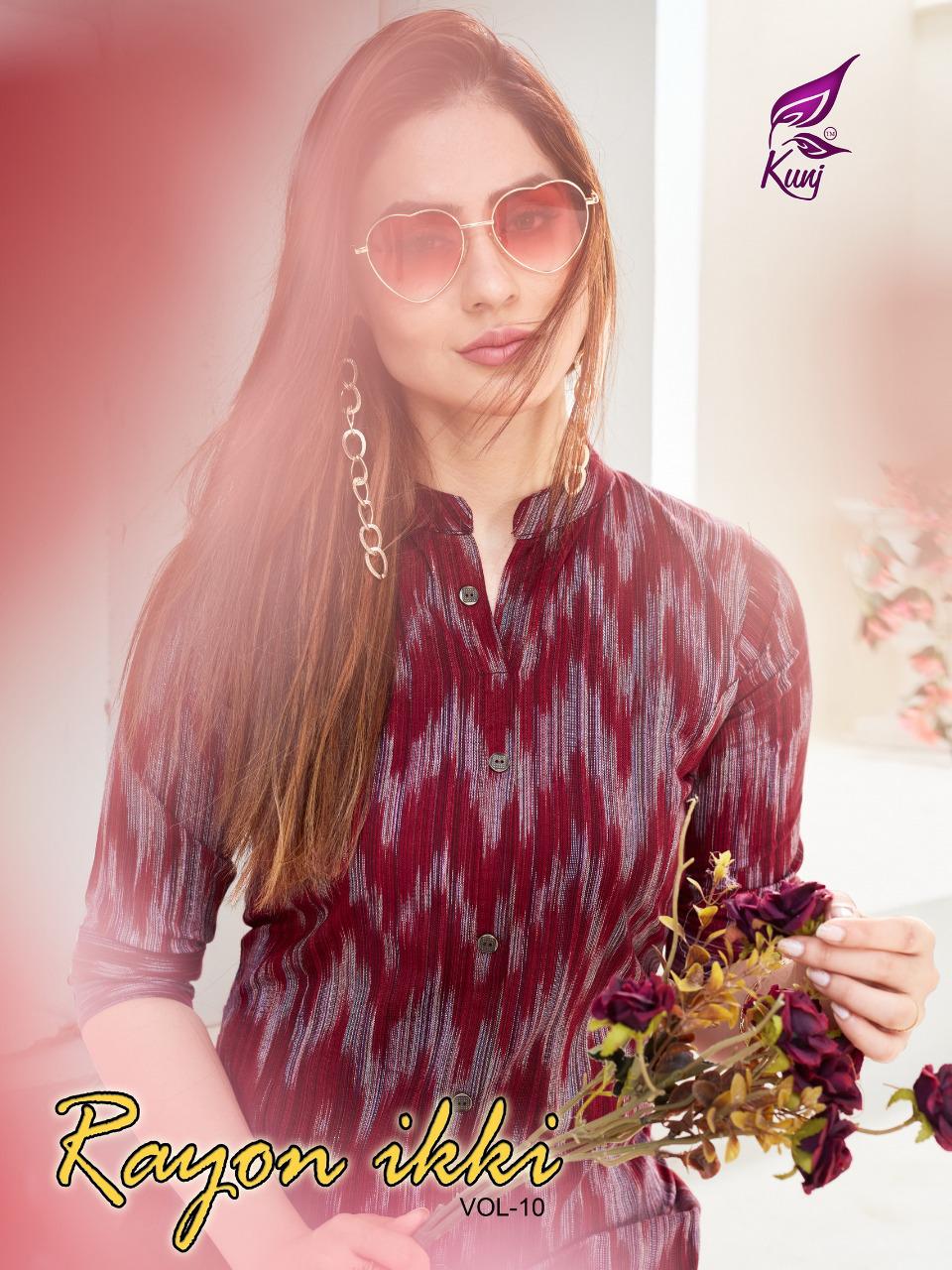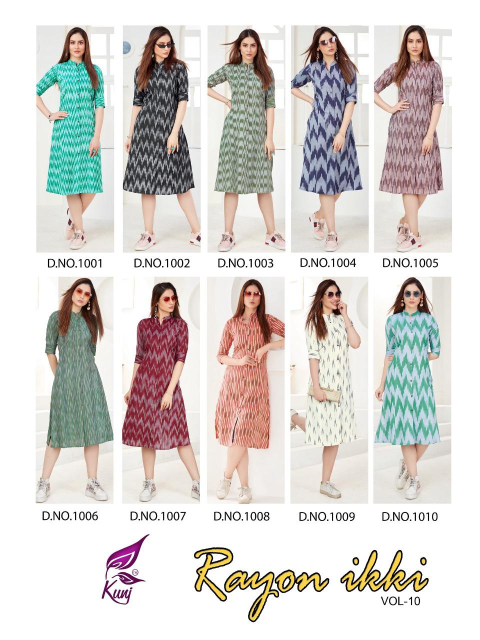 Kunj Rayon Ikki Vol 10 Rayon Ikkat Printed Long Fancy Formal Wear Exclusive Deisgner Kurtis