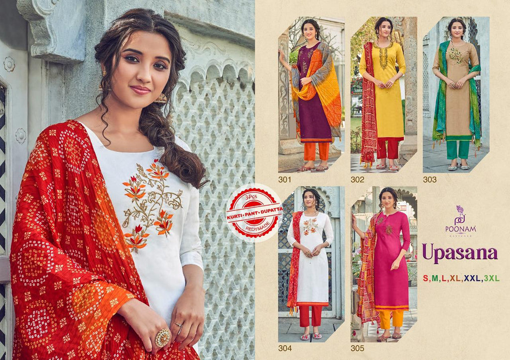Poonam Designer UpAsana Kurti :- Modal chanderi inner :- heavy crepe. Pent :- cotton slub Dupatta :- Bandhani. |