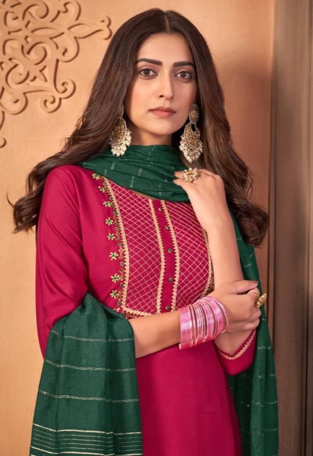 Top : Premium Silk With Pure Cotton Inner With Zardosi & Khatali Work                                                                                Bottom : Soft Silk With Pattern                                                    Dupatta : With Fancy Weaving                                                    Size : M , L, XL, 2XL, 3XL