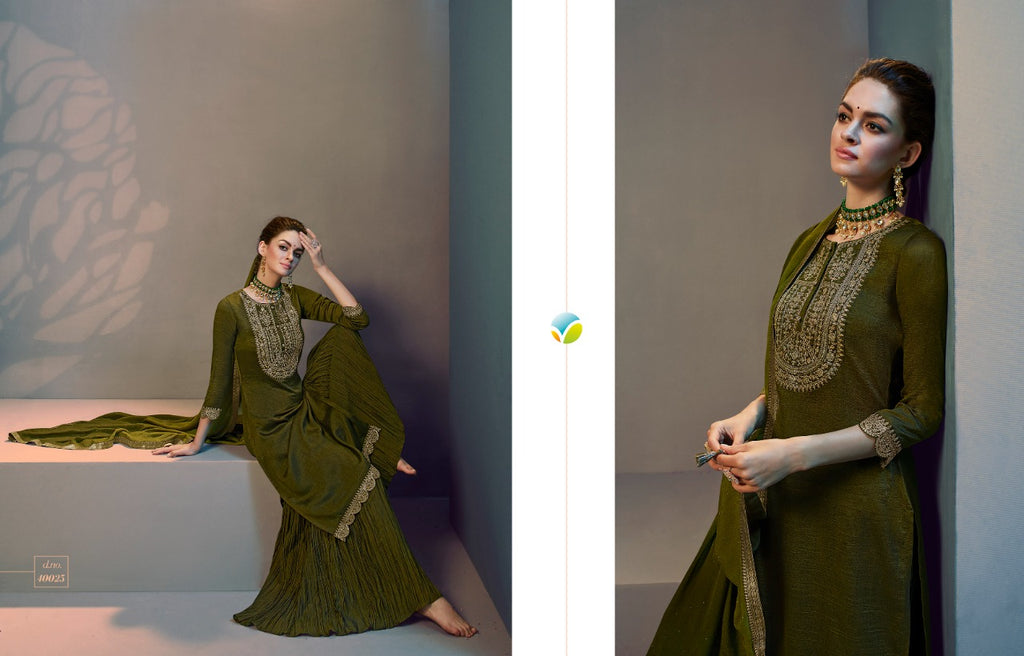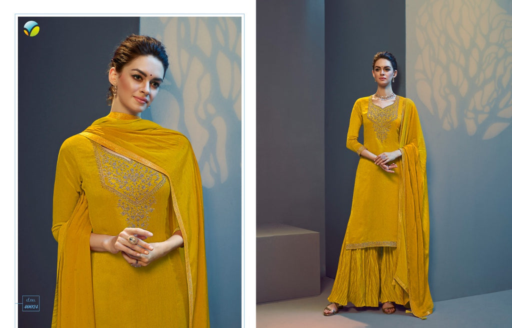 TUMBAA - ROZA SILK GEORGETE WITH INNER TOP WITH SILK GEORGETE SHARARA & CHINNON DUPATTA WITH DIAMOND WORK & 4 SIDE JACQUARD BORDER DUPATTA Size: M, L, XL, XXL, XXXL Avg Price: INR1530/- |