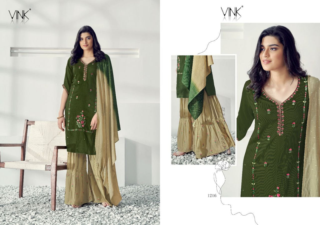 GLAM BY VINK KURTA WITH SHARARA & DUPATTA FABRIC – VISCOSE SILK BASE KURTA WITH EMBROIDERED MUSLIN SHARARA & PURE JACQUARD DUPATTA (BOUTIQUE STYLE) SHARARA WITH WORK !!! RATE – RS 999/- 6 DESIGNS SIZES – M(38), L(40), XL(42) & 2XL(44). |