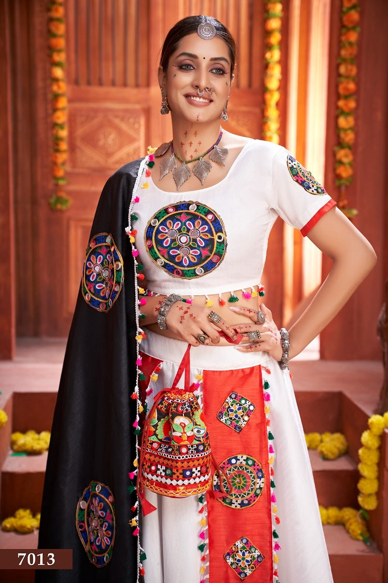 LEHENGA :- (FULL STITCHED 44) FABRIC :- ART SILK COLOUR :- WHITE LENGTH :- 44" SIZE :- 44" WORK :- GAMTHI ,MIRROR TYPE :- UMBRELLA FLAIR :- 5 MTR WORK :- HEAVY EMBROIDERY THREAD +READY MADE LACE + PATCH BLOUSE :- (UNSTITCH) FABRIC :- ART SILK WORK :- HEAVY EMBROIDERY THREAD + READY MADE LACE BLOUSE COLOUR :- WHITE DUPATTA DUPATTA FABRIC :- ART SILK (2.30 MTR) DUPATTA WORK :- READY MADE LACE + PATCH DUPATTA COLOUR :- BLACK WEIGHT :- 1.1 KG |