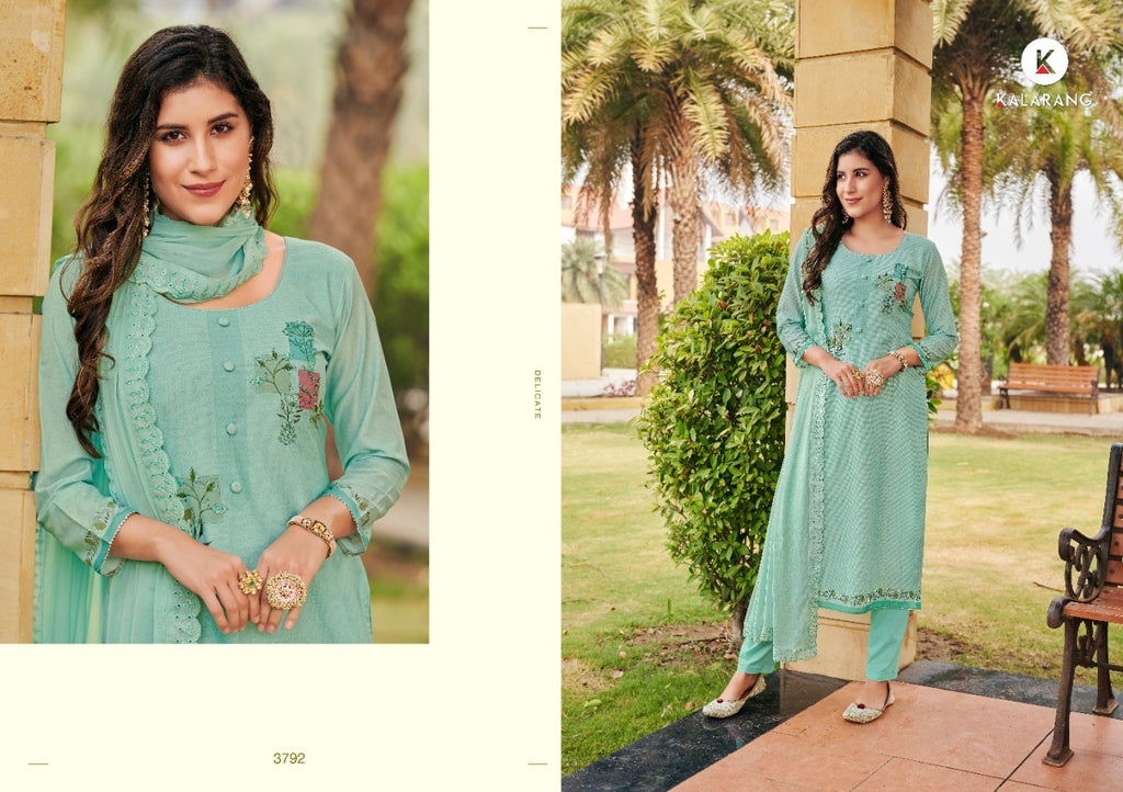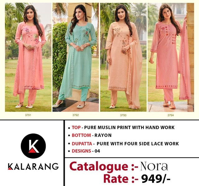 Fabric Details Top:- *Pure Muslin Print With Hand Work* Bottom:- *Rayon* Dupatta:- *Pure With Four Side Lace Work* |