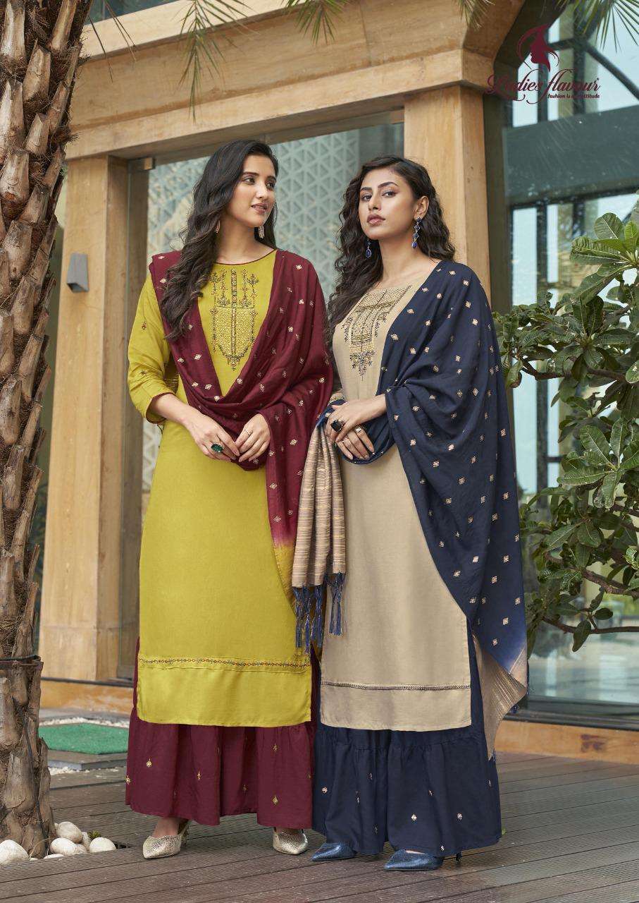 Top:- Musline With Embroidey With Heavy Khatli Work Bottom :- Musline Sharara With Embroidery Work(3 mtr Flair) Dupptta :-Pure Naylon Viscose Weaving Pattern(2.20 cut & 36 Panna) Size : M(38), L(40), XL(42), 2XL(44), 3XL(46) |