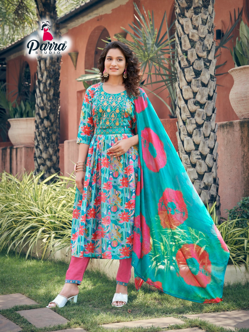 TOP :- MASLIN DEGITAL PRINT WITH EMBROIDERY SEQUENCE WORK & HALF INNER PENT :- SILK BOTTOM WITH EMBROIDERY WORK DUPATTA :- CHINON DUPATTA SEBURI DYEING |