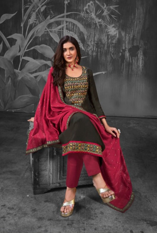 Fabric Details Top :- Heavy Parampara Silk With Embroidery & Swarovski Diamond Bottom :- Rayon Dupatta :- Pure Model Silk 2mm Weaving Sequence Minakari With Four Side Work Border |