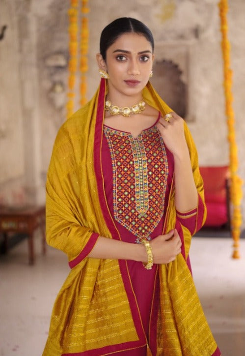 Fabric Details ▪Top :- Heavy Parampara Silk With Embroidery Mirror Work ▪Bottom :- Heavy Parampara Silk ▪Dupatta :- Pure Viscose Weaving Sequence Four Side Border |