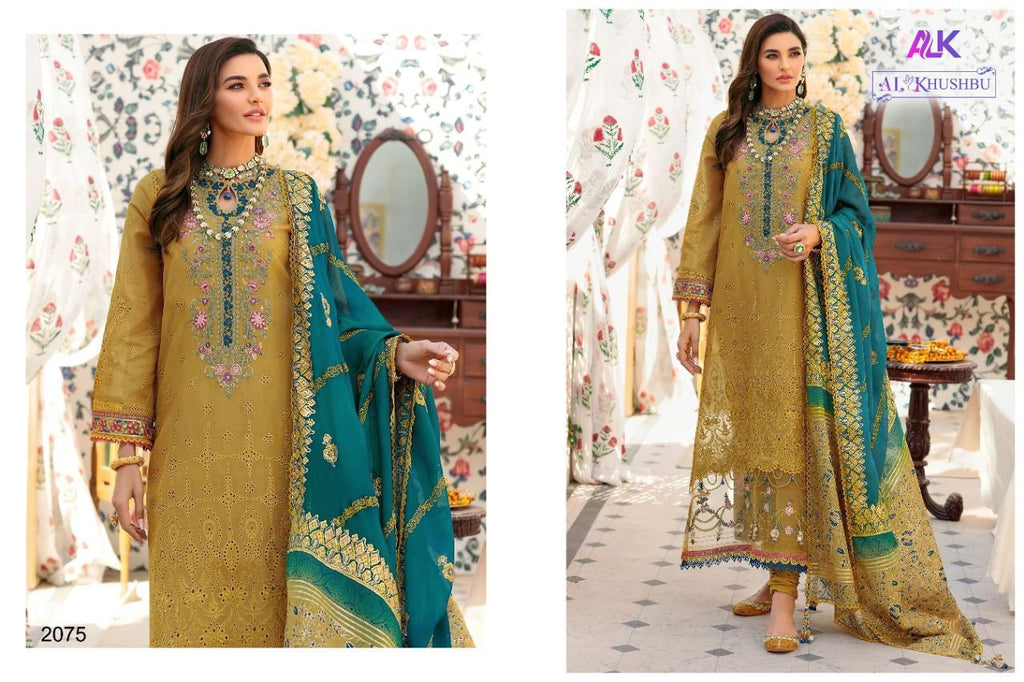 Fabric Details Top : Pure Cambric Cotton With Heavy Embroidery & Moti Work Bottom :Pure Pc Cotton Dupatta : Pure Silver Chiffon Printed |