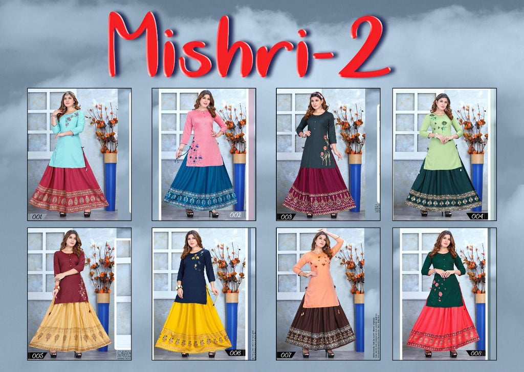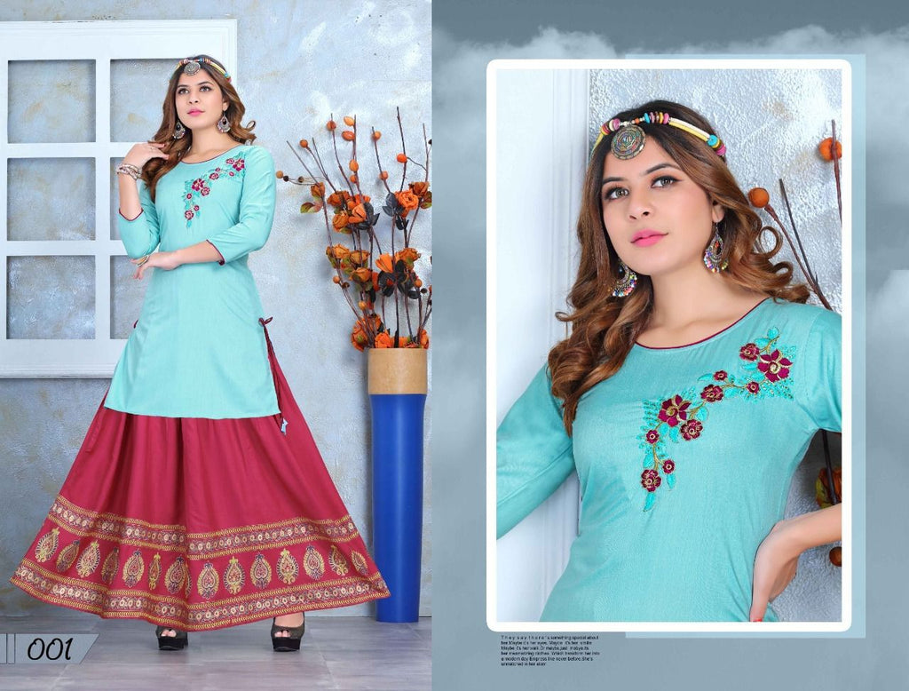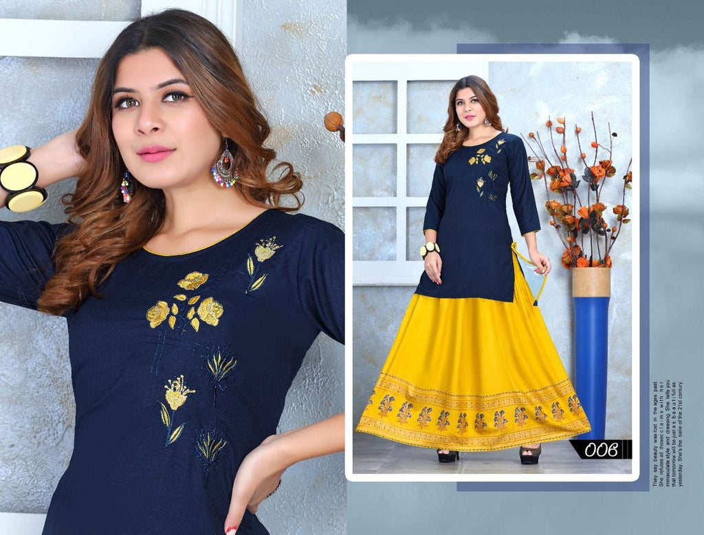 Two Piece Catalogue Design:- 08 Style = Top Skirt Material:- Top= 17 Kg Dobby Rayon Top Length:- 34 Inch Bottom = 17 kg Rayon Bottom Length:- 40 Inch Pattern:- Embroidered Size= L XL 2XL |