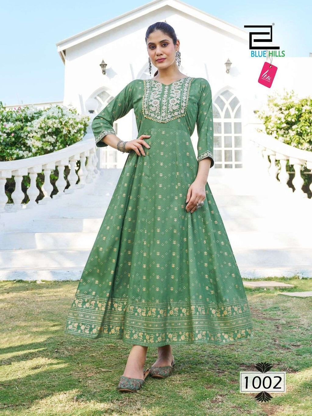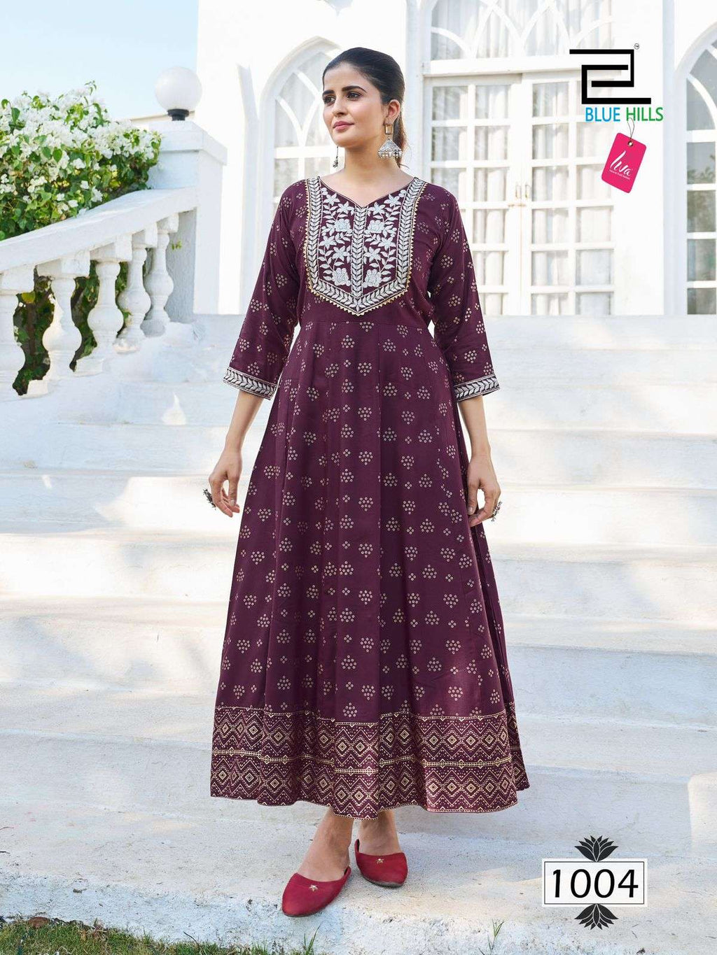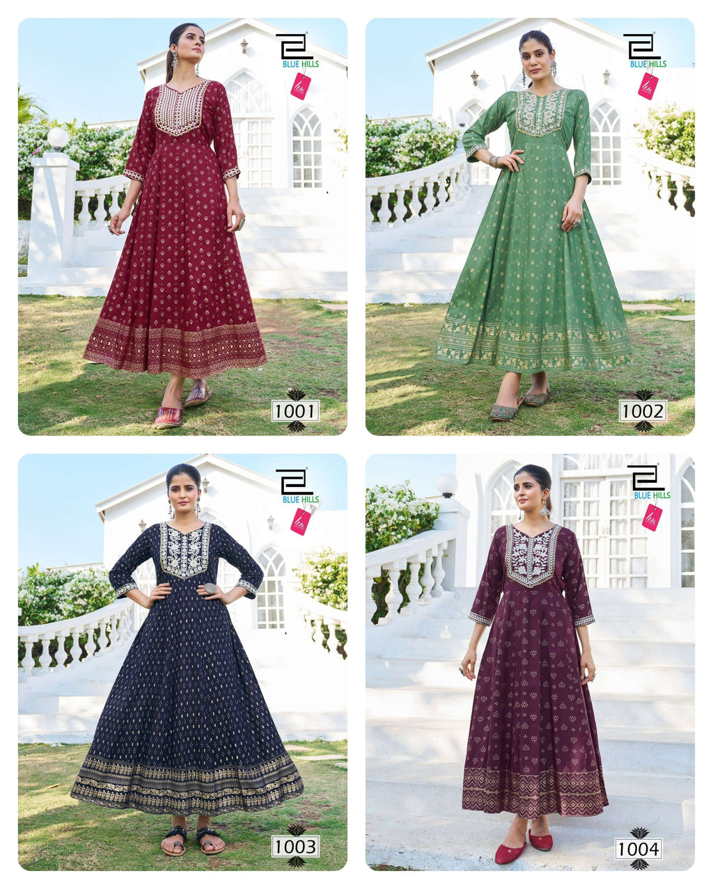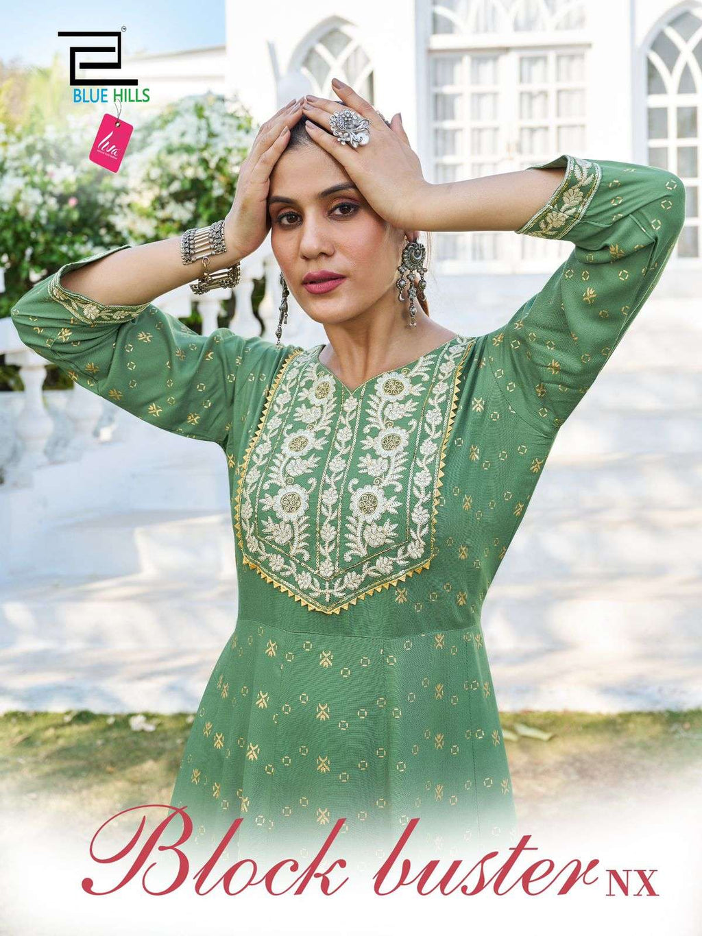 Blue Hills Block Bluster Nx Rayon Anarkali Gown With Neck Embroidery And Accessories Designer Kurti