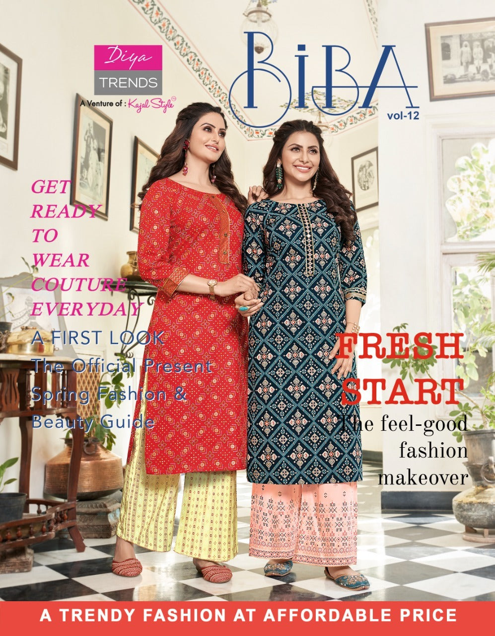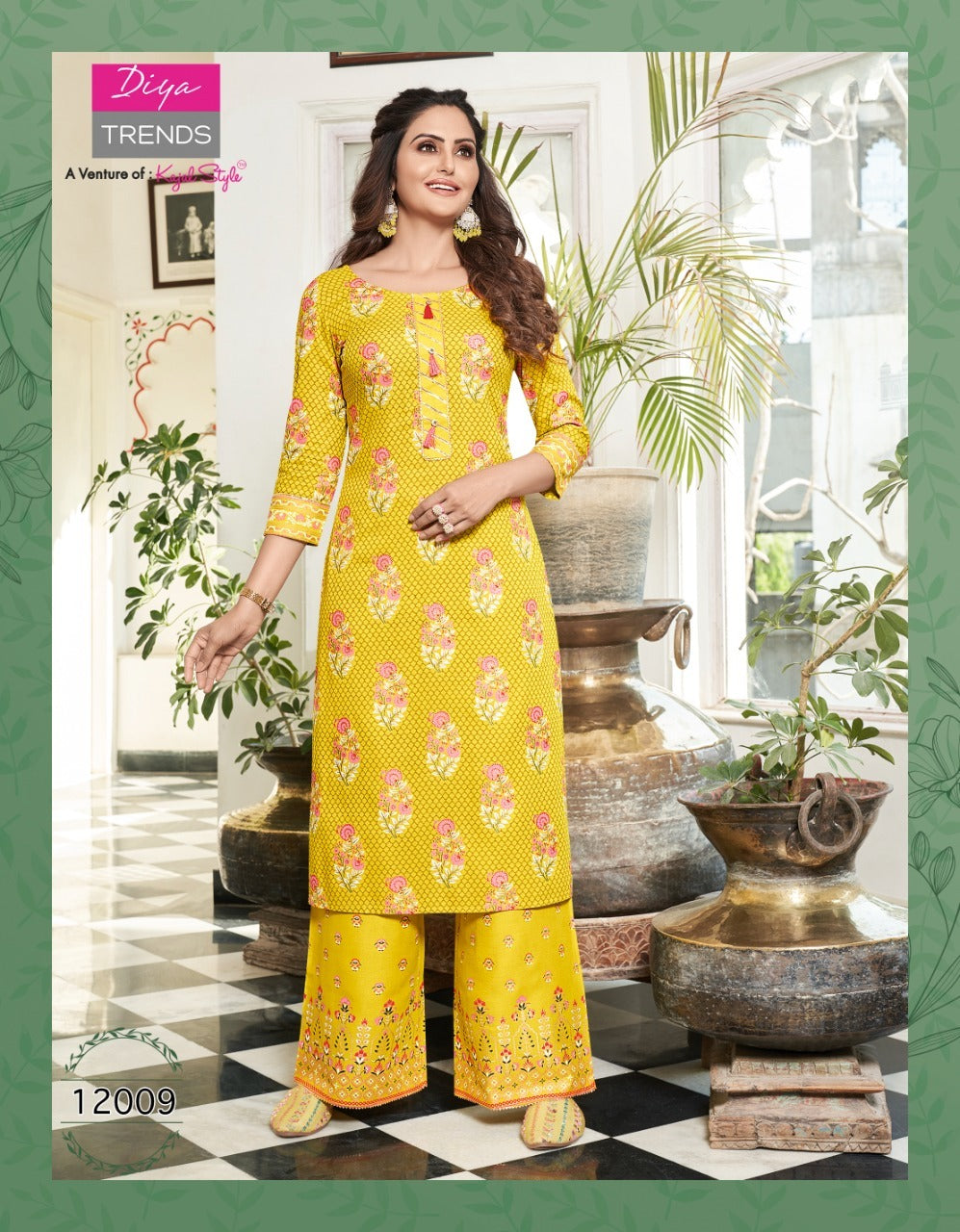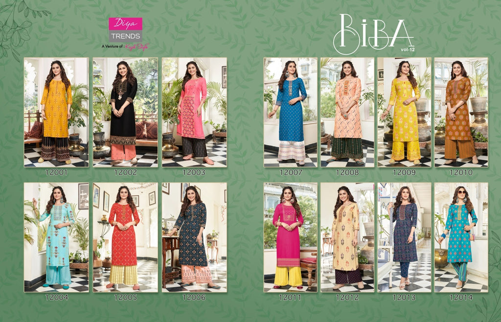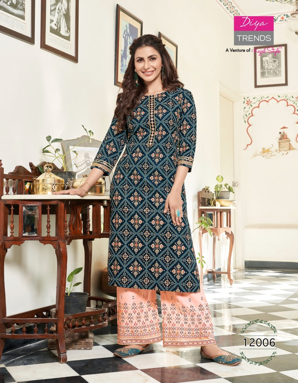 Diya Trends Bibas Vol 12 Rayon Party Wear Fancy Gold Print Kurtis With Plazo Bottom