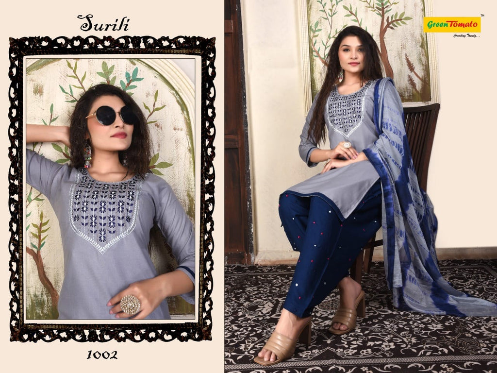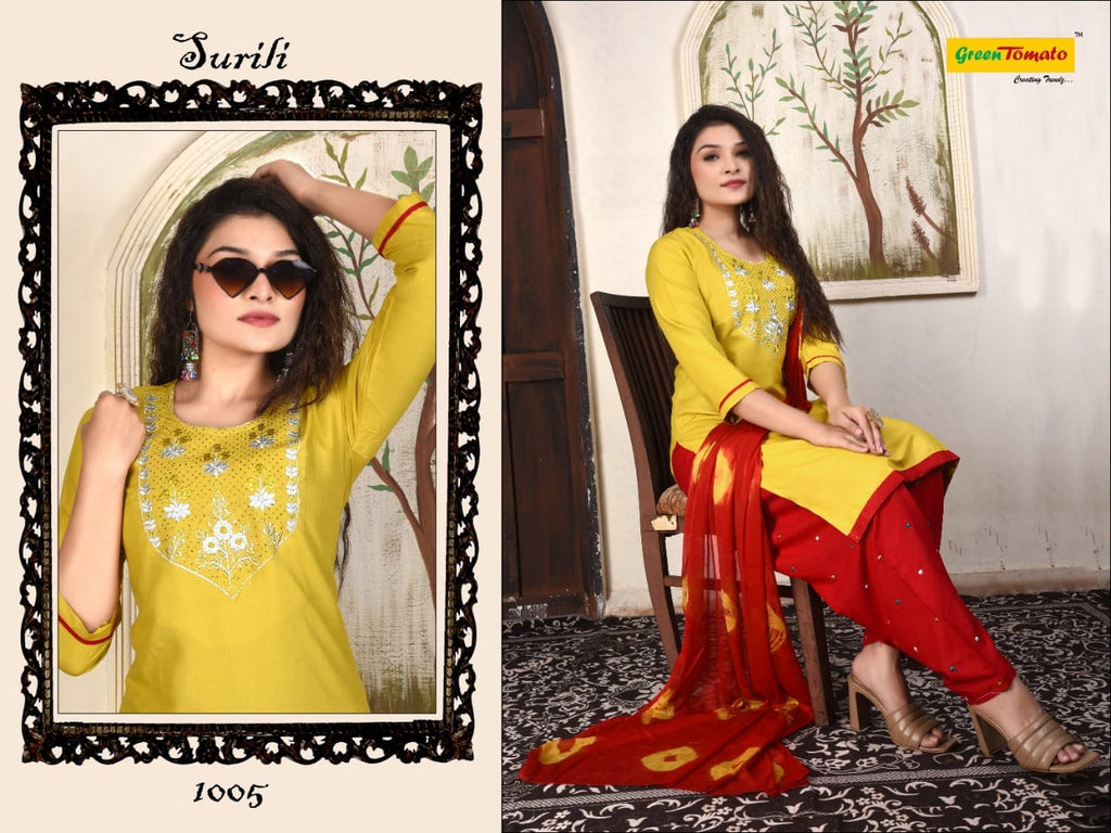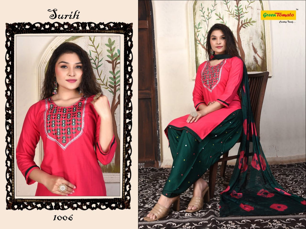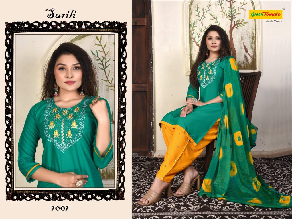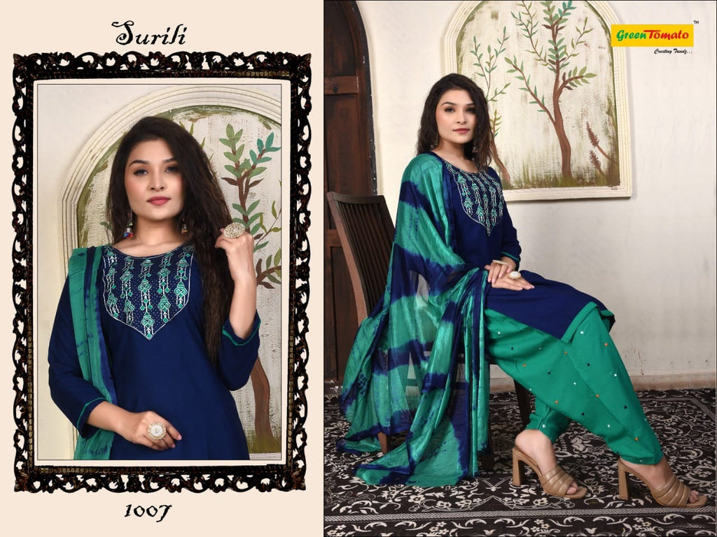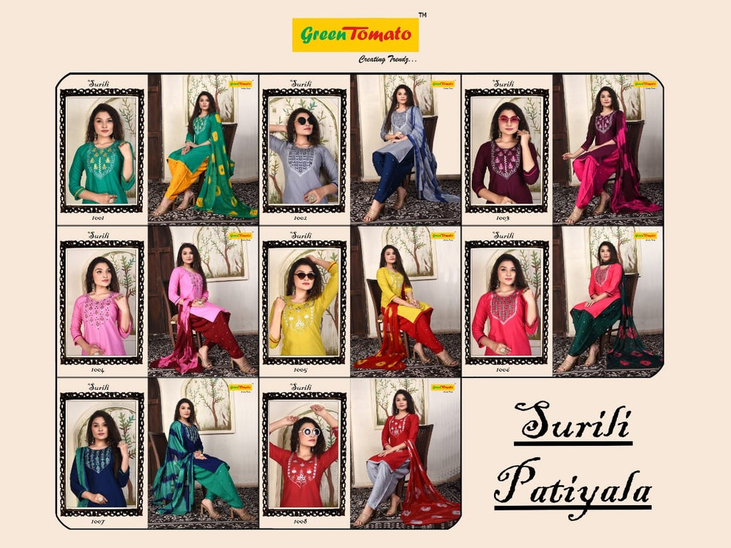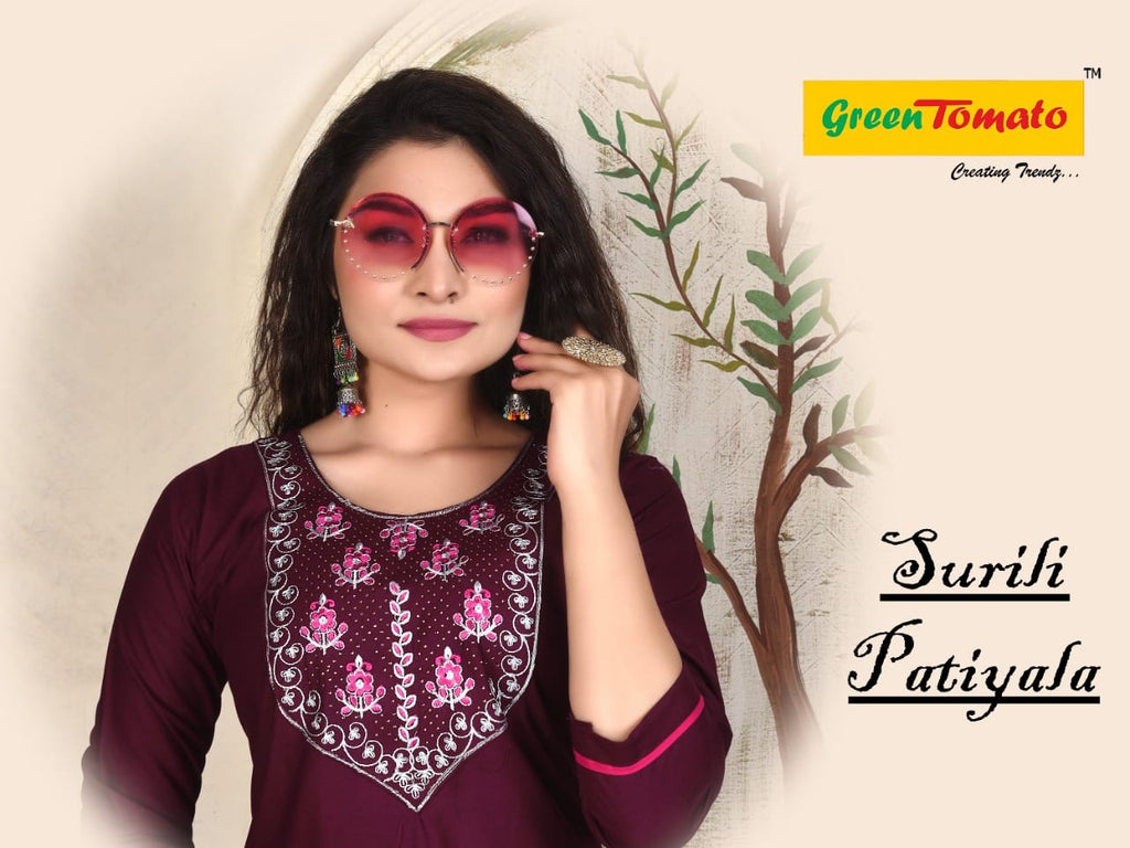 Green Tomato Surili Patiyala Rayon Party Wear Kurtis With Patiyala Style Bottom & Dupatta