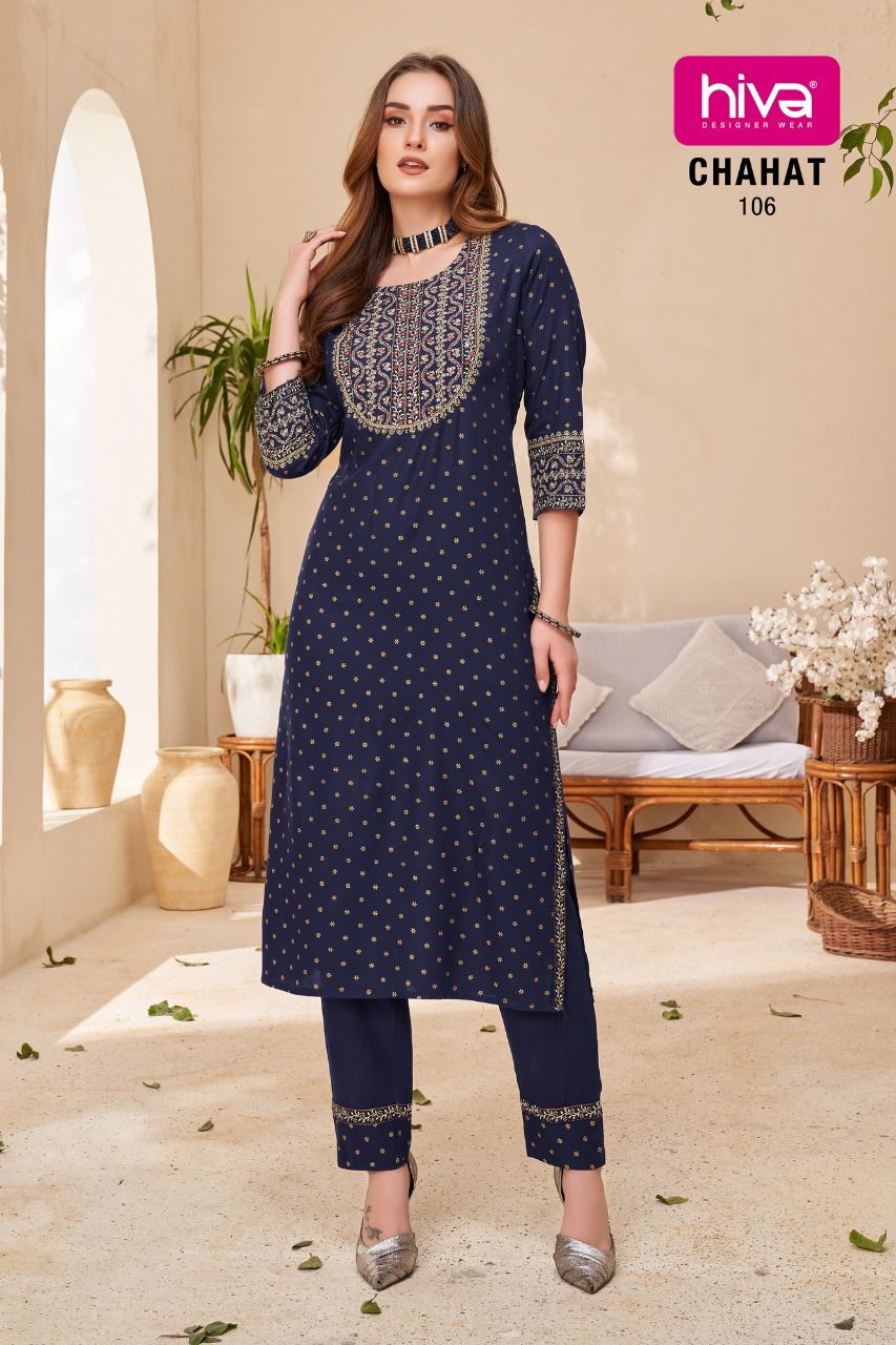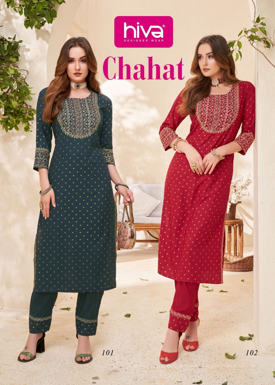 Hiva Designer Chahat Rayon Printed Fancy Party Wear Kurtis With Pants