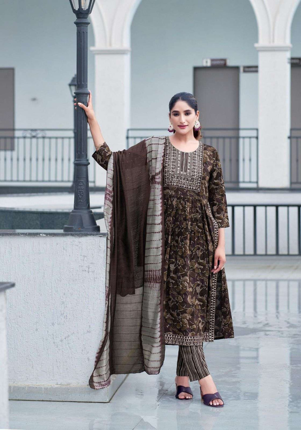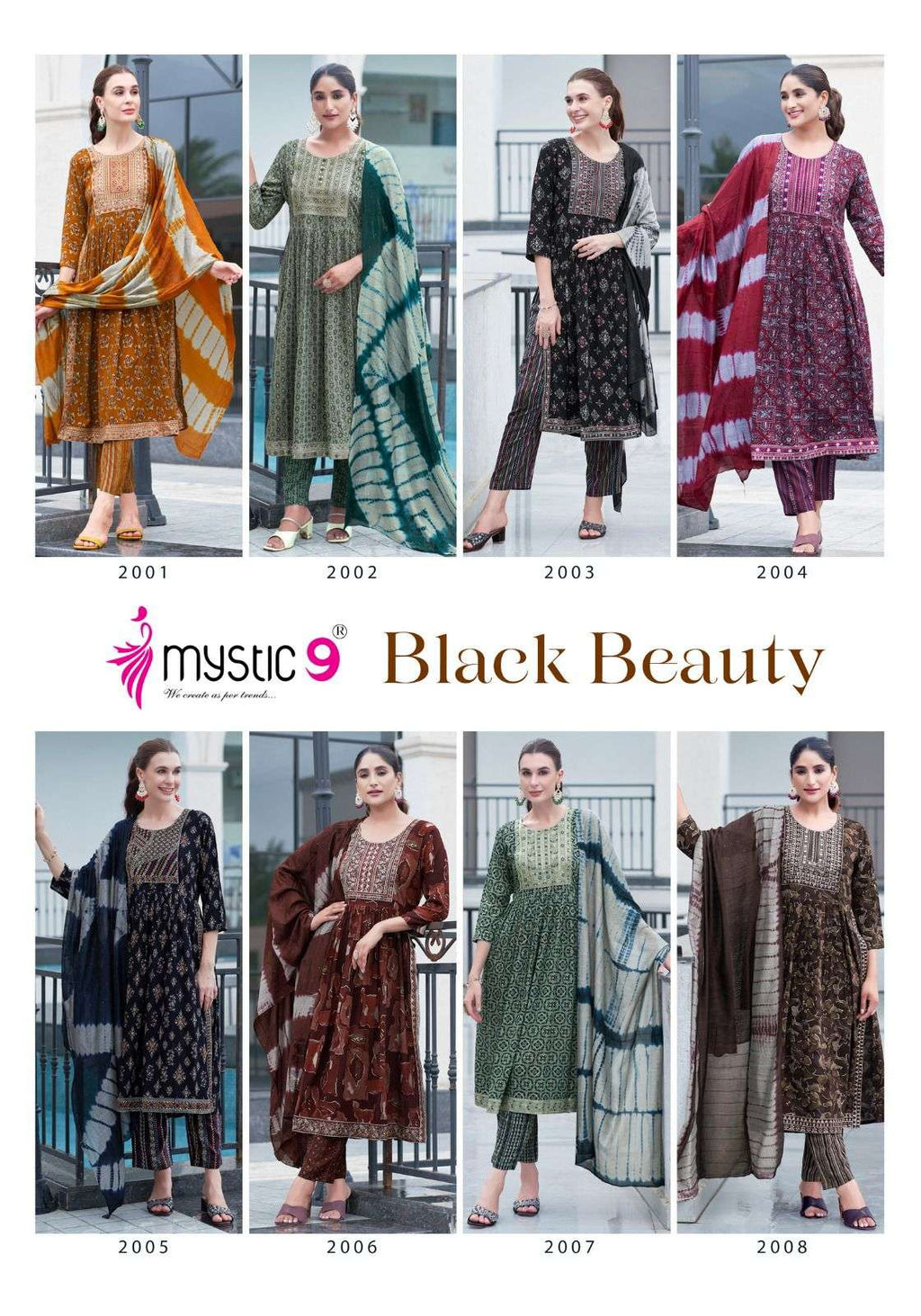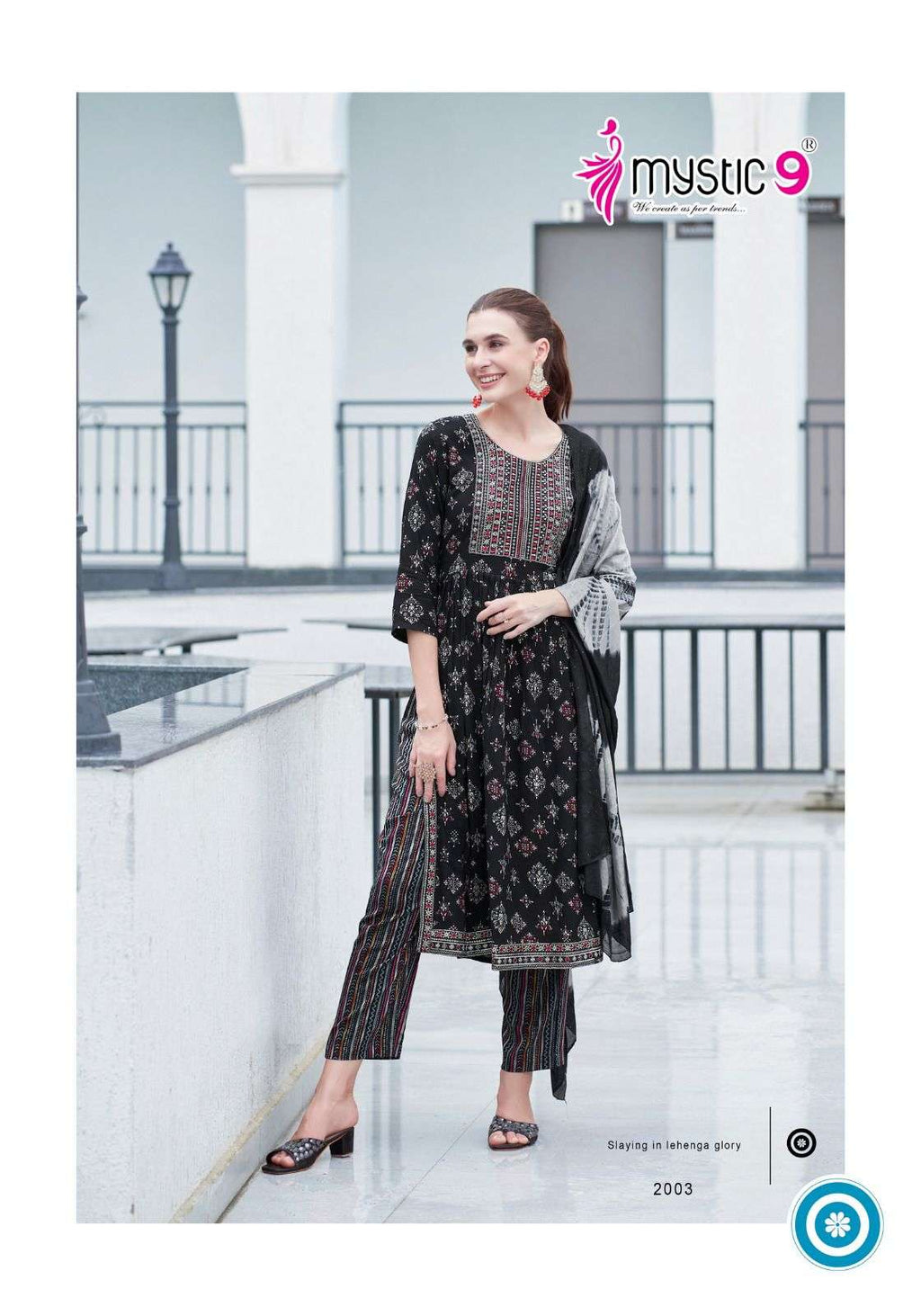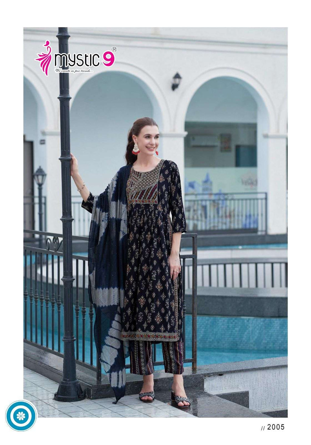 Mystic 9 Black Beauty Vol 2 Rayon Foil Print Nyra Cut Casual Wear Kurti Pant Dupatta Set