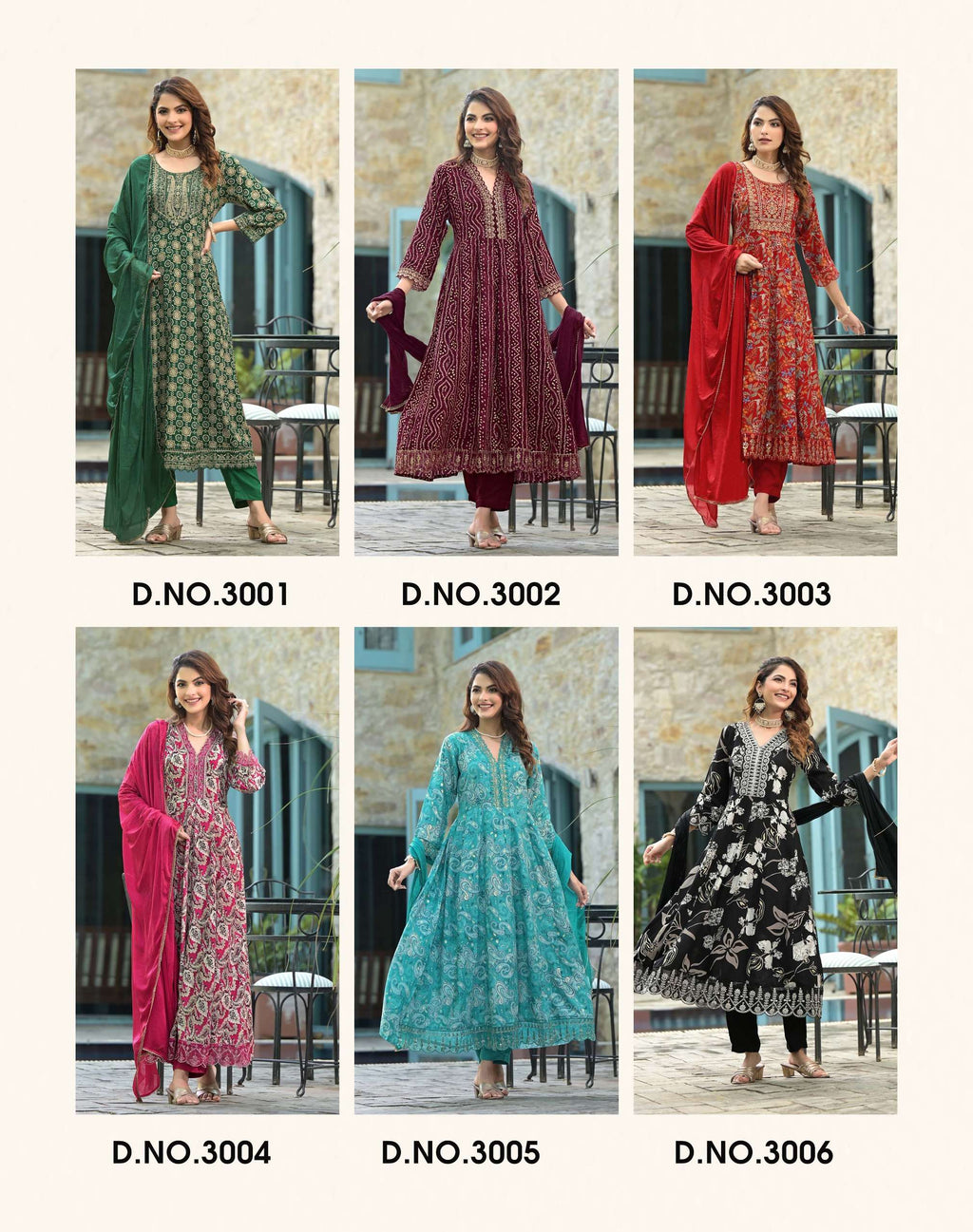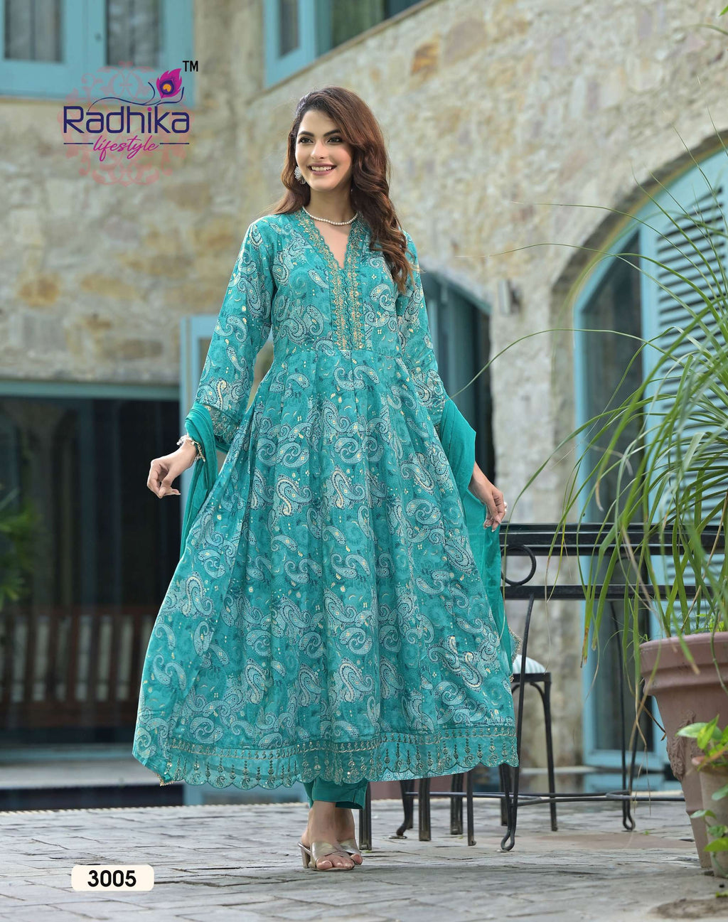 Radhika Lifestyle Anarkali Vol 3 Rayon Foil Print Embroidery Work Kurti Pant Dupatta Set