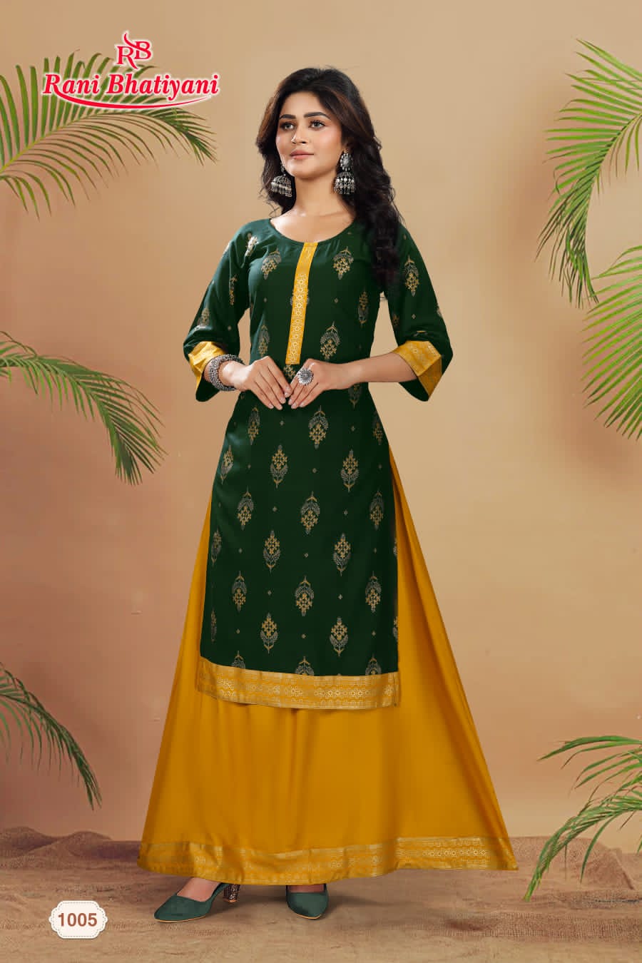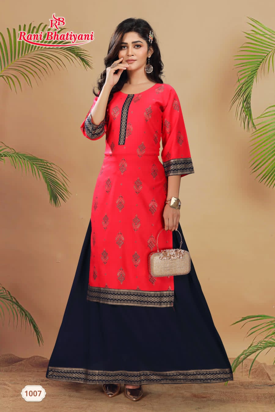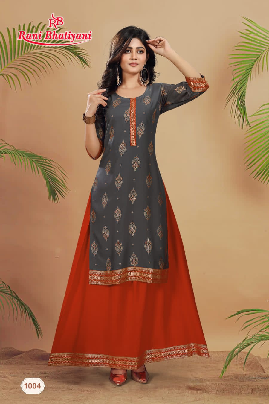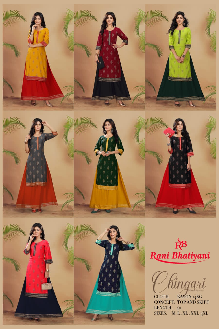 Rani Bhatiyani Chingari Rayon Foil Printed Fancy Party Wear Kurtis With Skirt