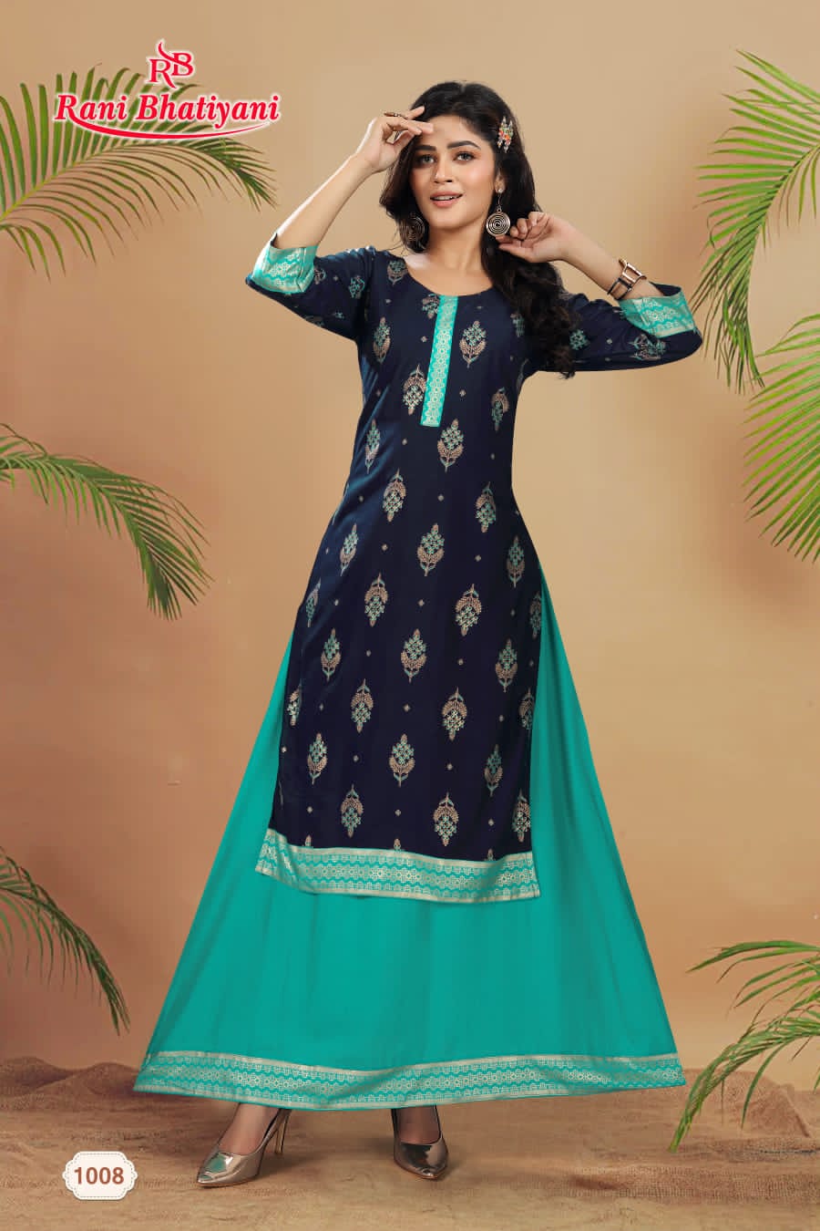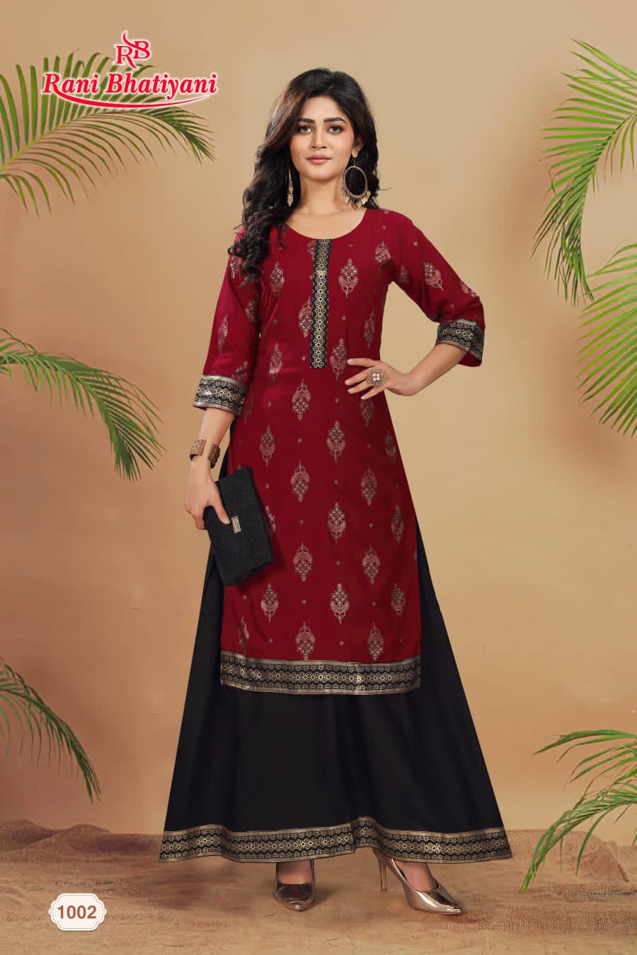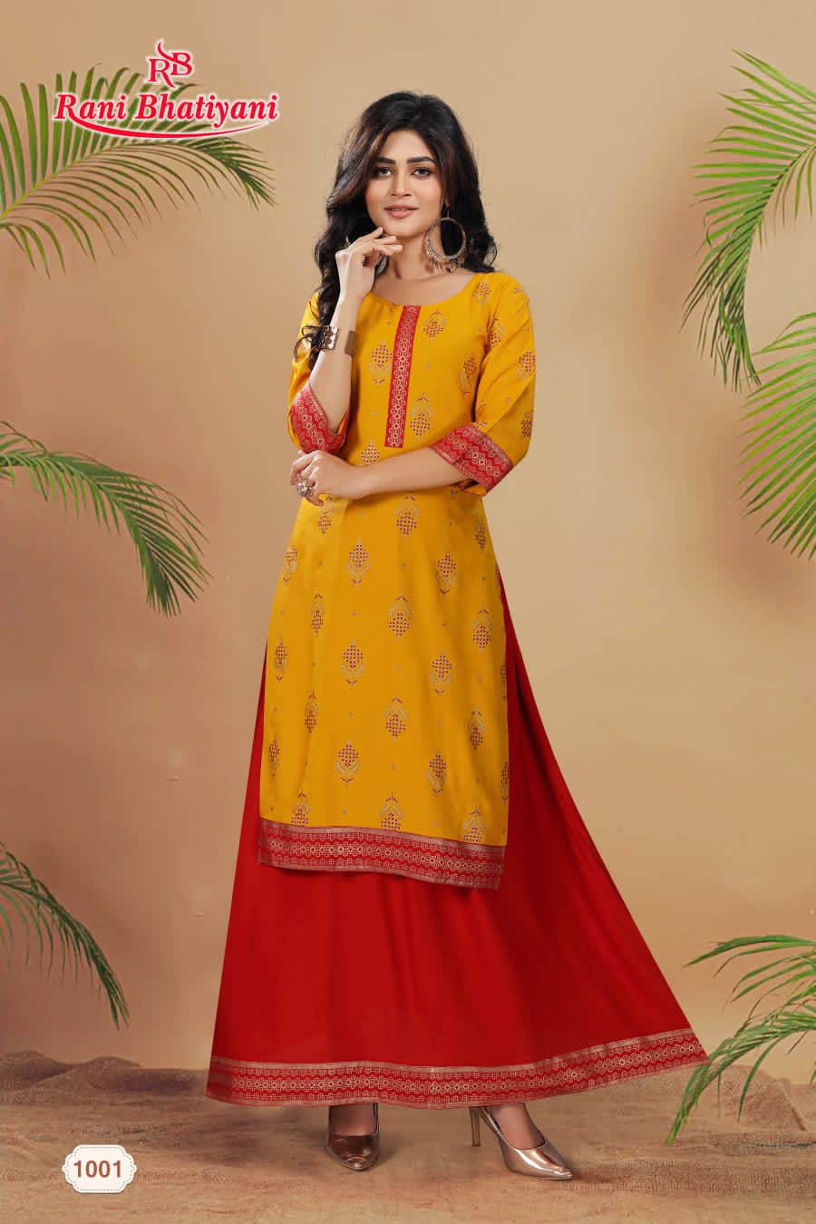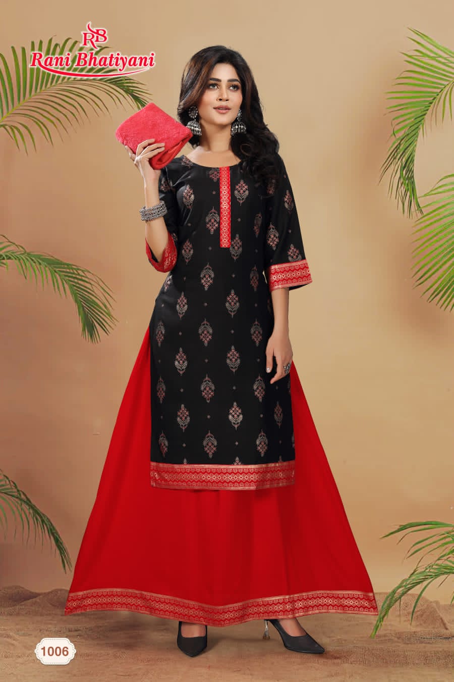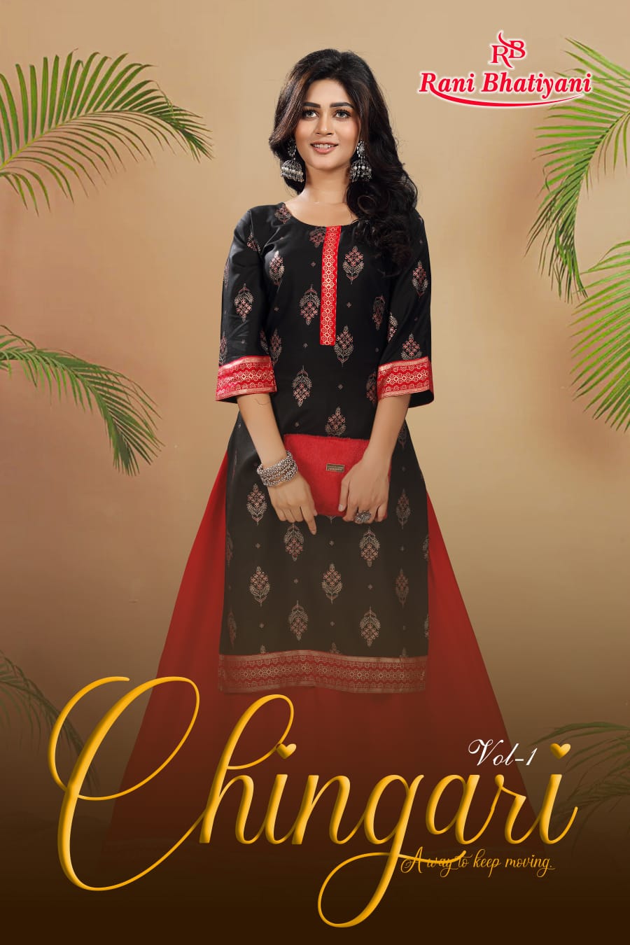 Rani Bhatiyani Chingari Rayon Foil Printed Fancy Party Wear Kurtis With Skirt