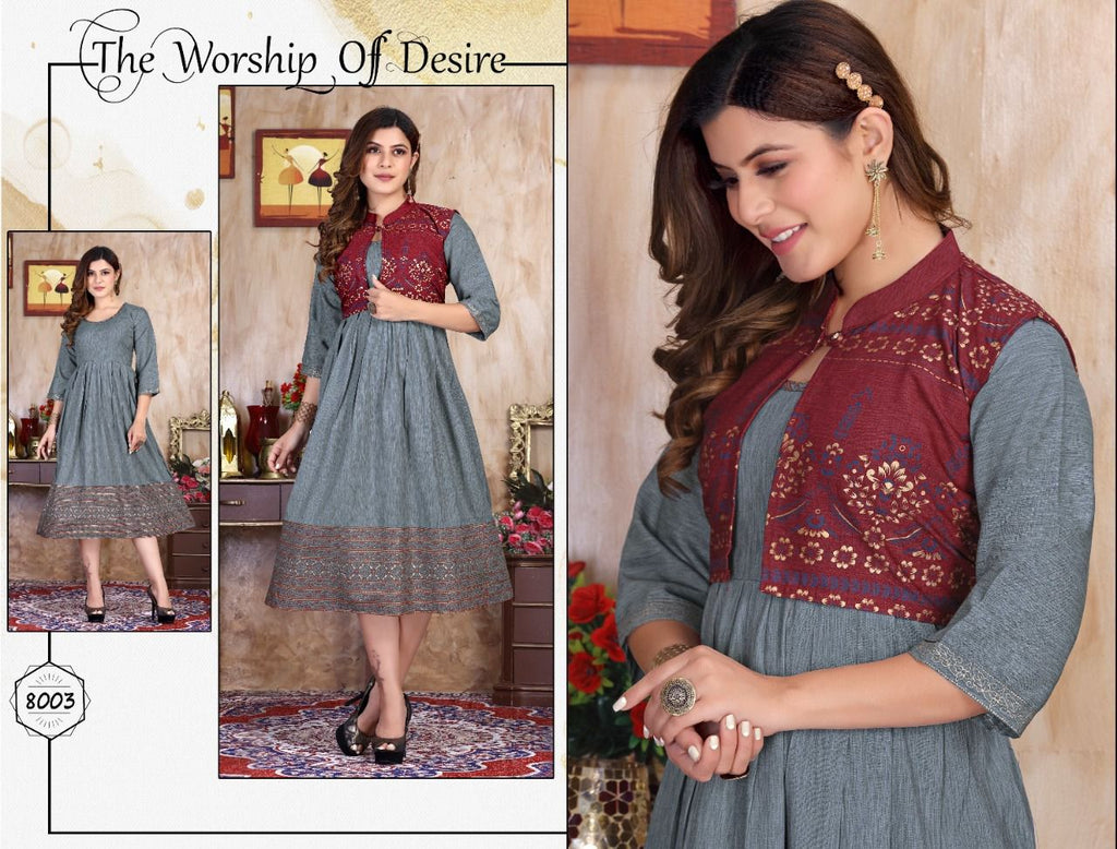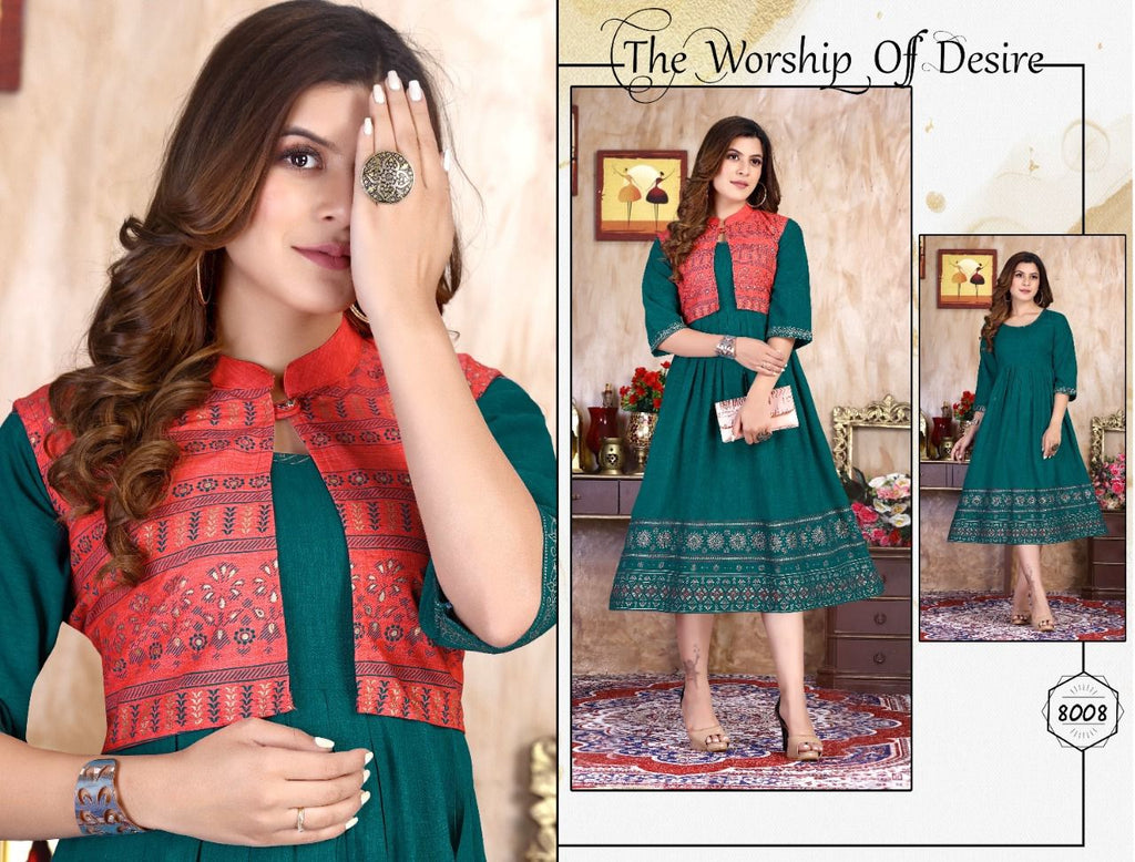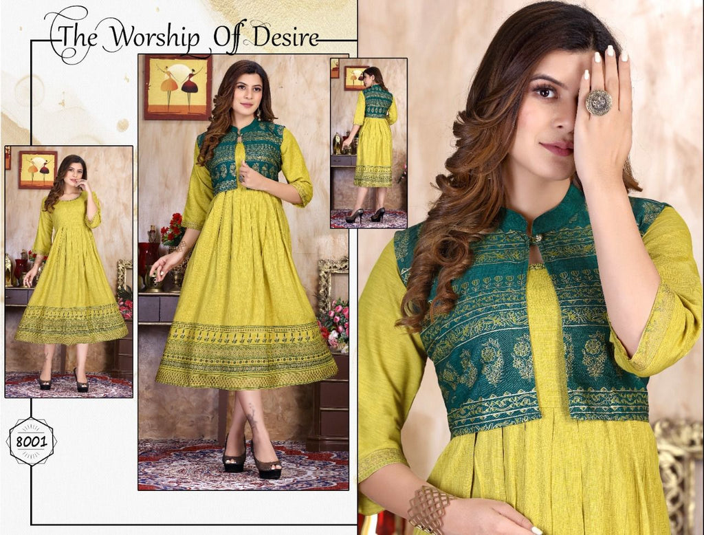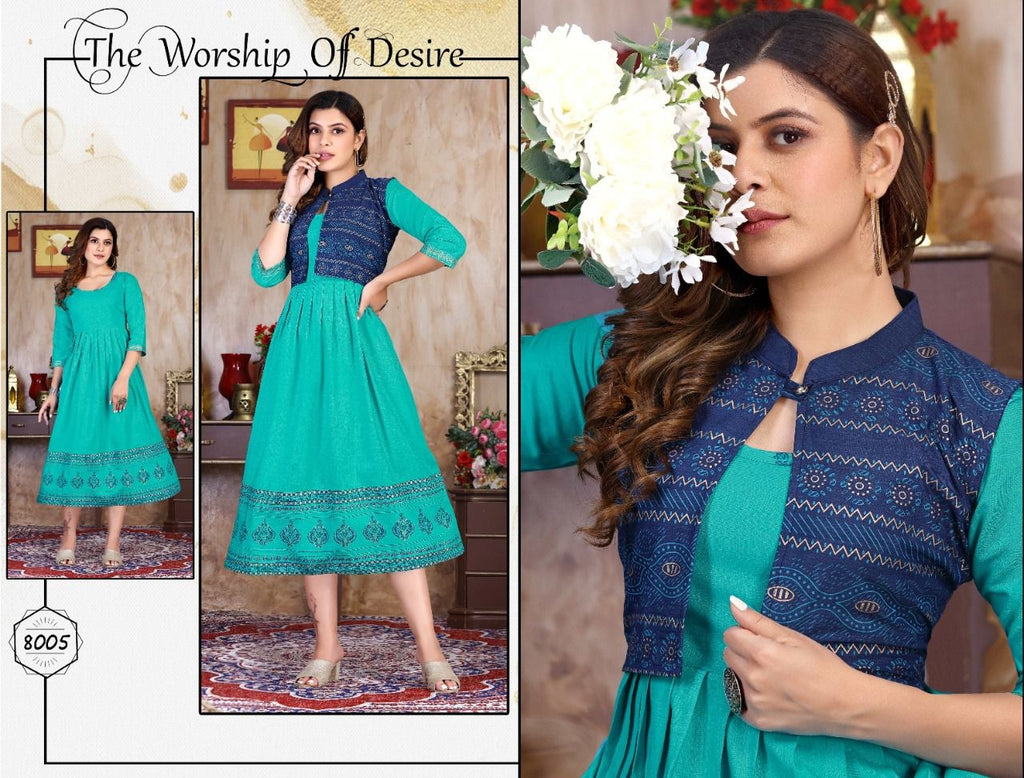 Details : Design :- 8 Style :- A-Line Kurta Pattern :- Foil Print Fabric :- 14 Kg Liquid Size :- S. M. L. XL. 2XL 3XL Length :- 48 Inch |