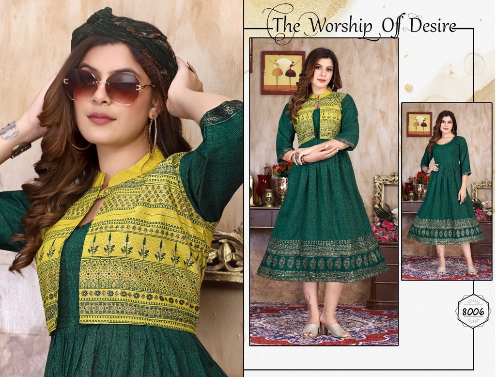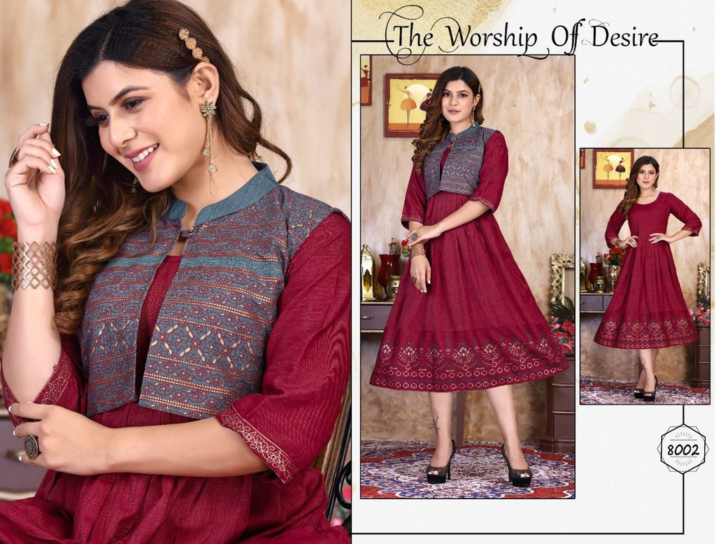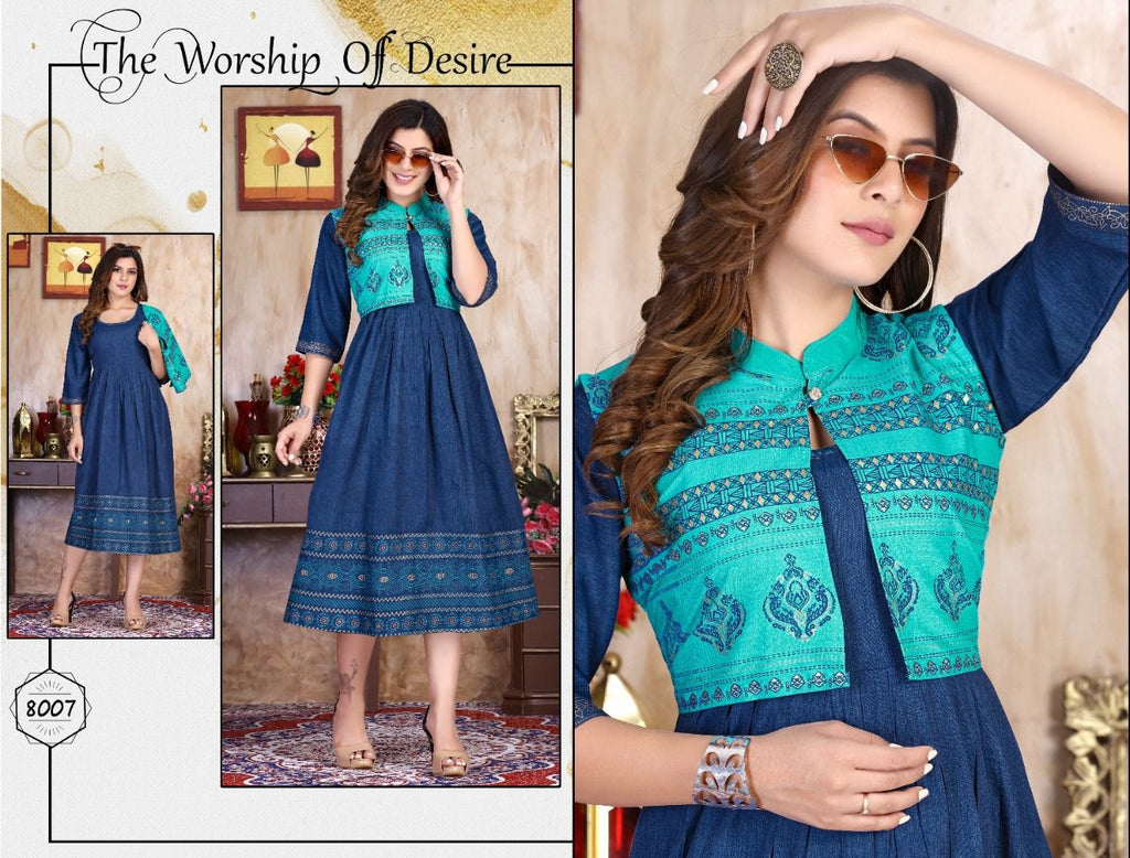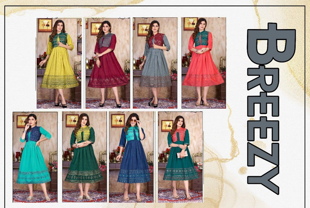 Details : Design :- 8 Style :- A-Line Kurta Pattern :- Foil Print Fabric :- 14 Kg Liquid Size :- S. M. L. XL. 2XL 3XL Length :- 48 Inch |